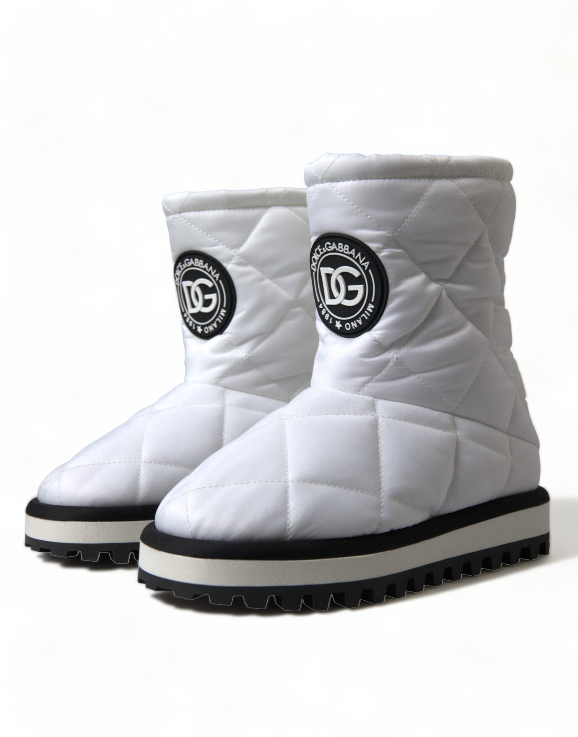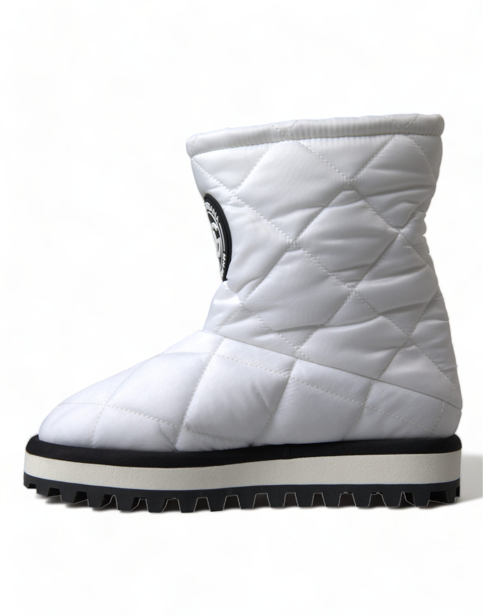 Indulge in the epitome of winter luxury with these striking white quilted mid-calf boots by Dolce & Gabbana. These boots exude elegance with their shiny new tags and pristine condition. Designed to blend sophistication with comfort, they feature a standout rubberized logo badge set against pure white for an undeniably upscale look. Their slip-on style ensures ease of wear, while their construction provides a cushioned embrace for your feet, thanks to the soft leather interior and snuggly wool insole. The non-slip rubber sole offers stability with every step, creating a harmonious balance between functionality and high fashion—direct from the artisans of Italy to your wardrobe.