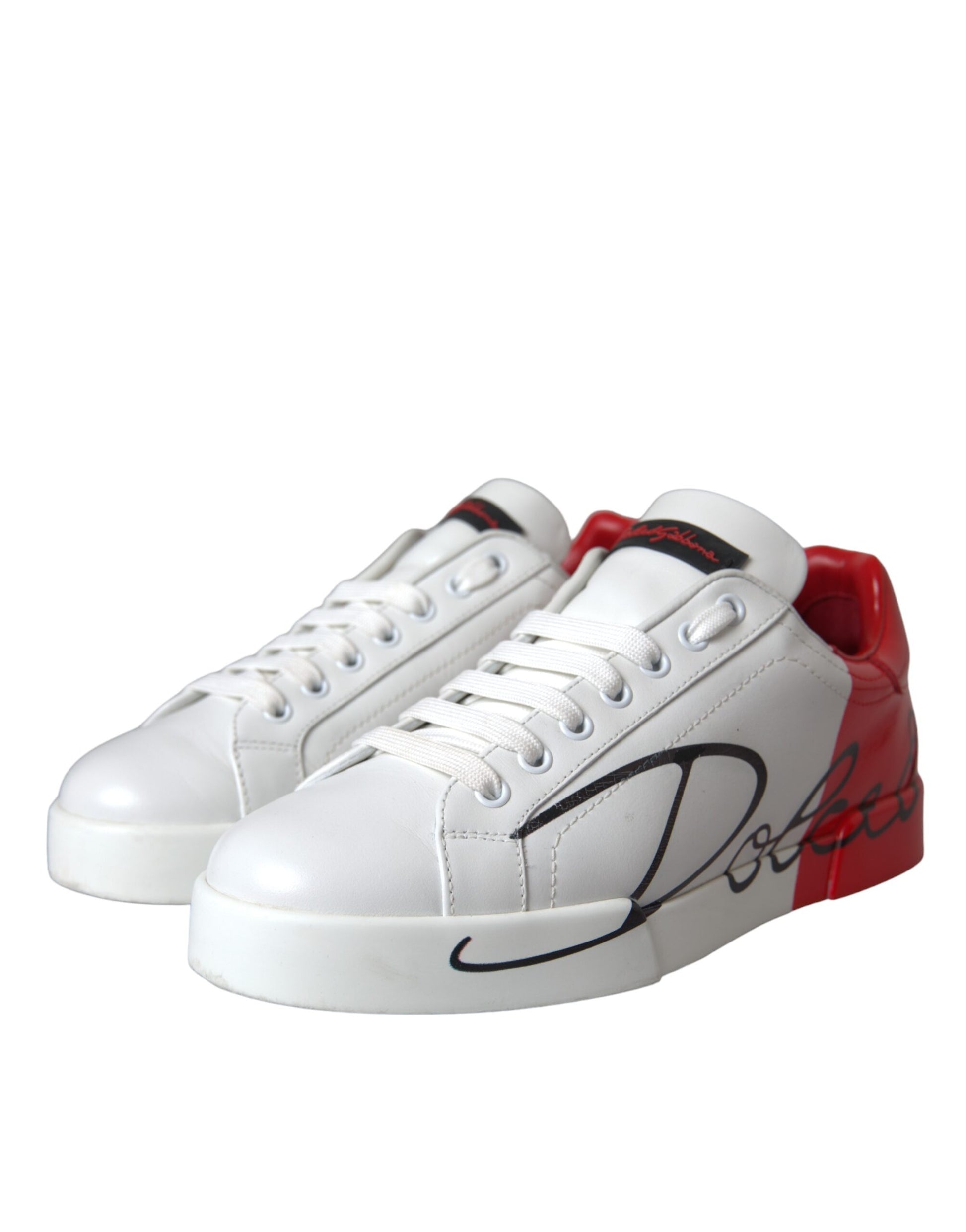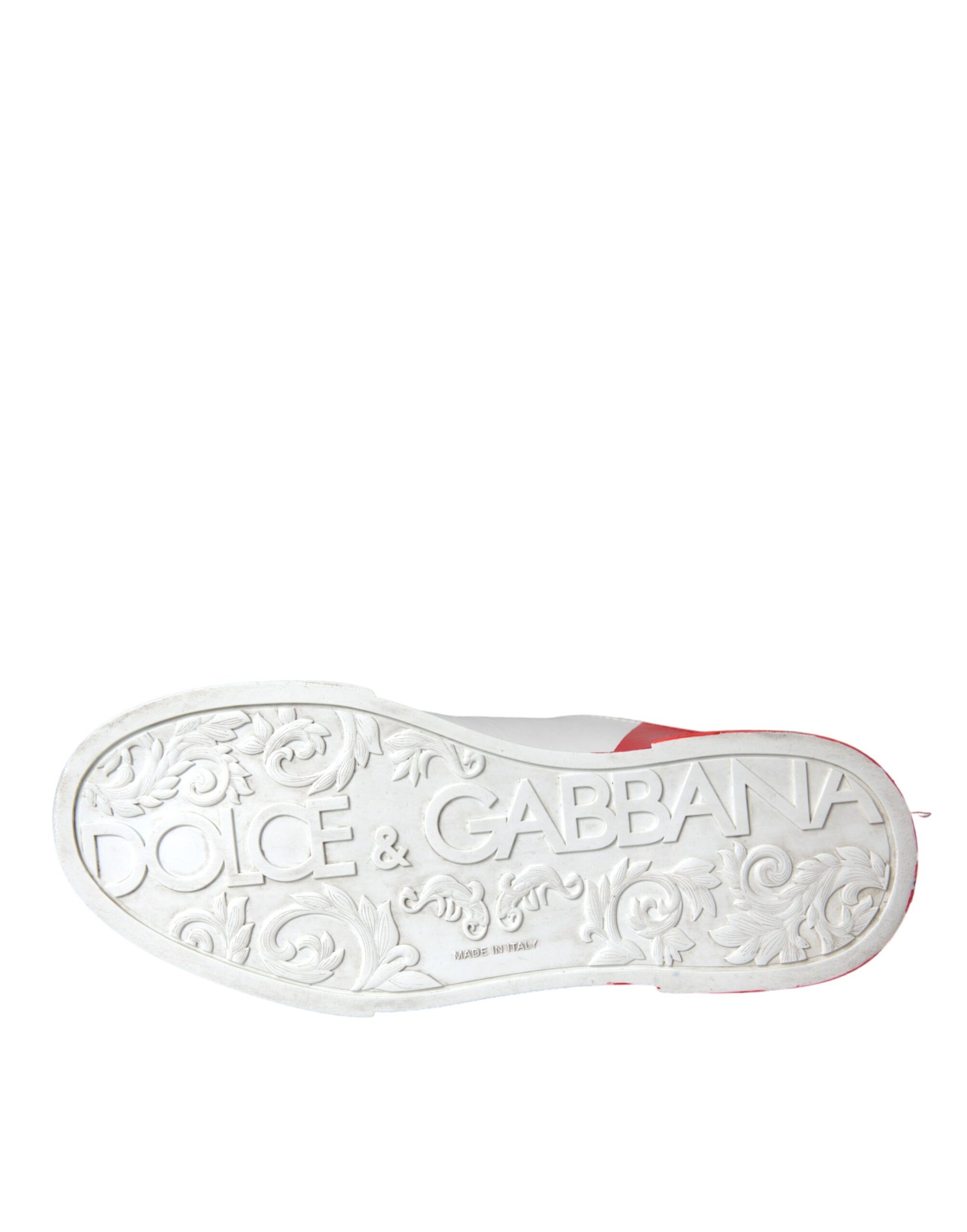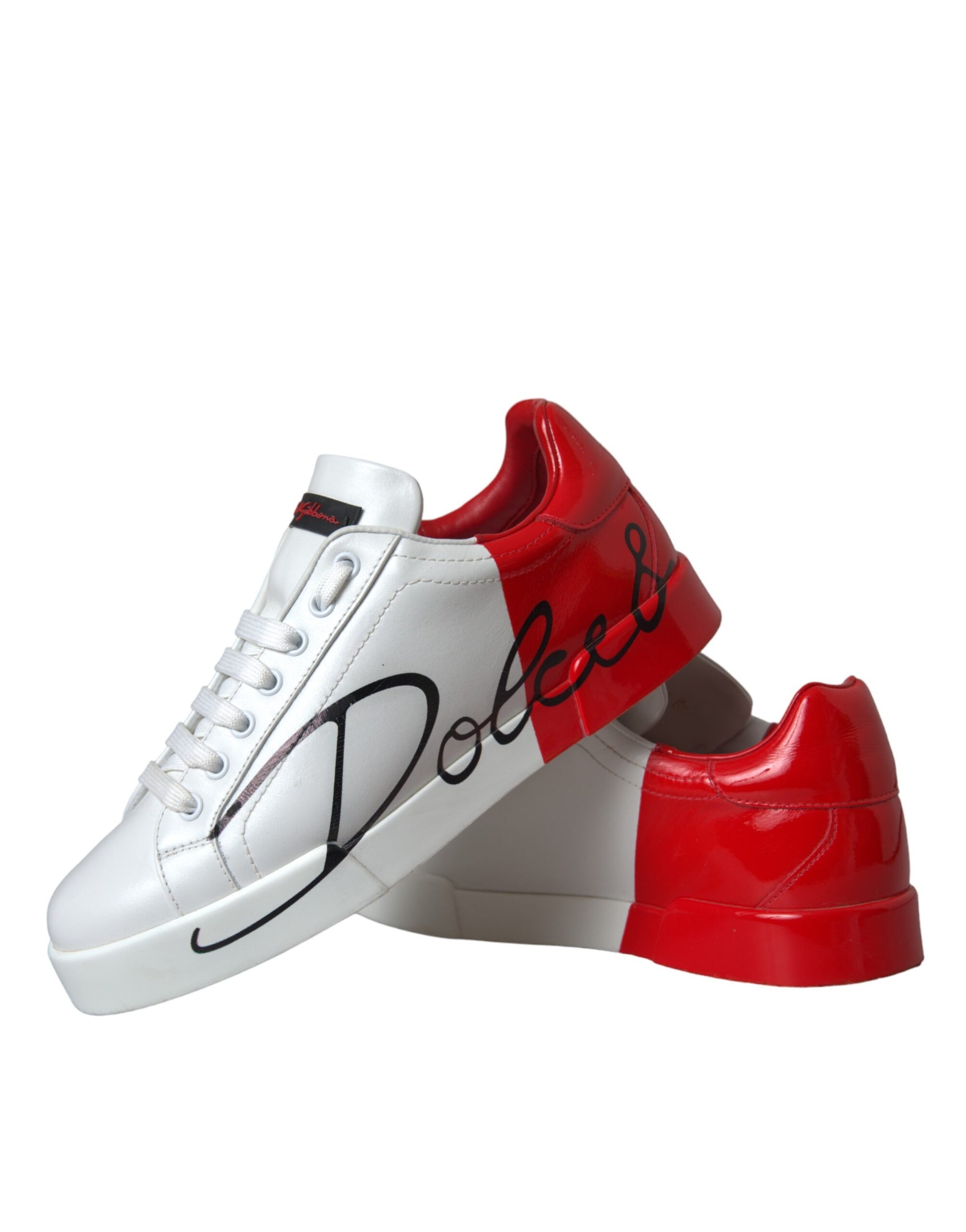 Gorgeous preowned with tags, 100% Authentic Dolce & Gabbana Portofino sneakers come with the brand name lettered on them. Made from leather in a red and white shade, they feature lace-up vamps, round toes, and comfortable rubber soles.