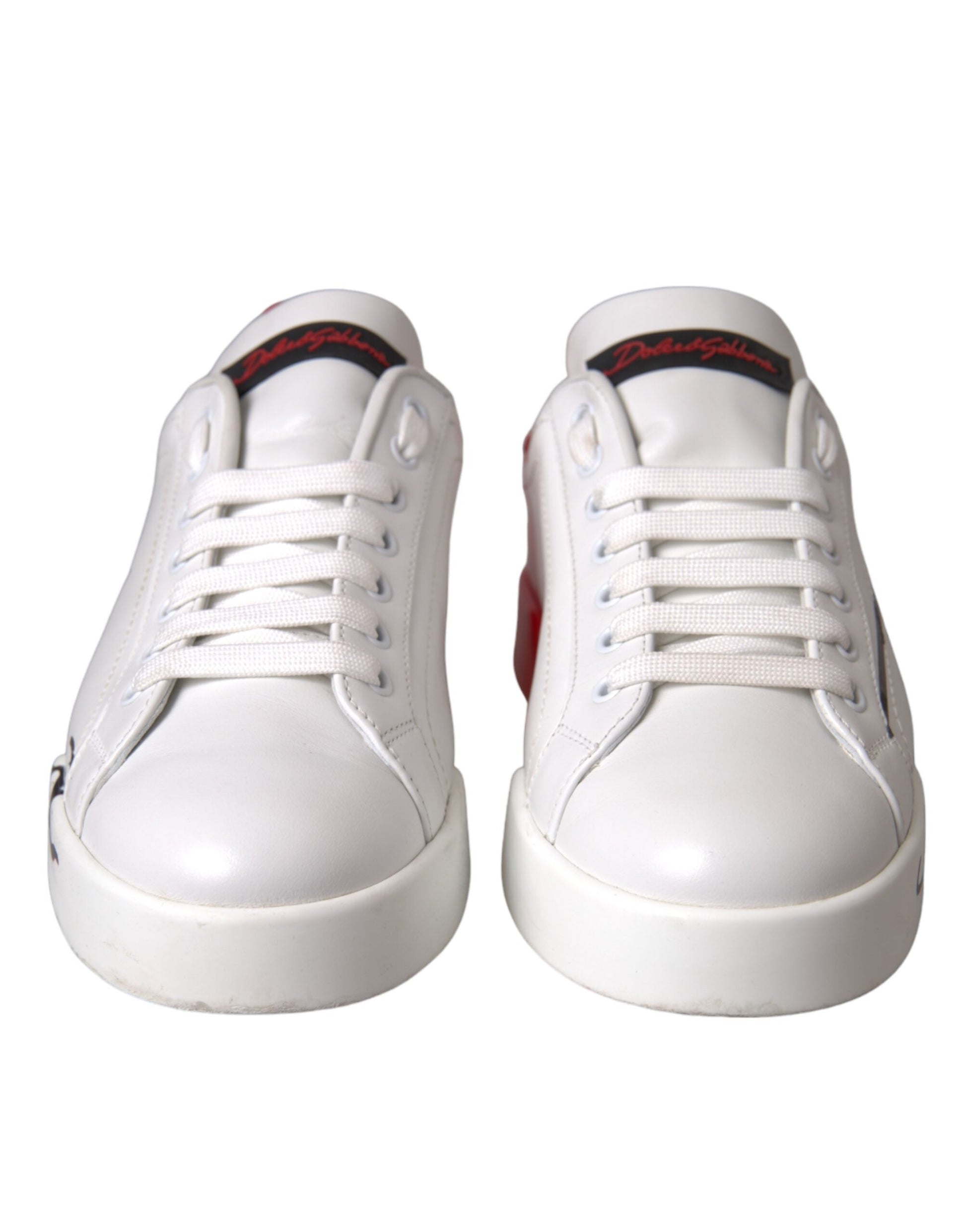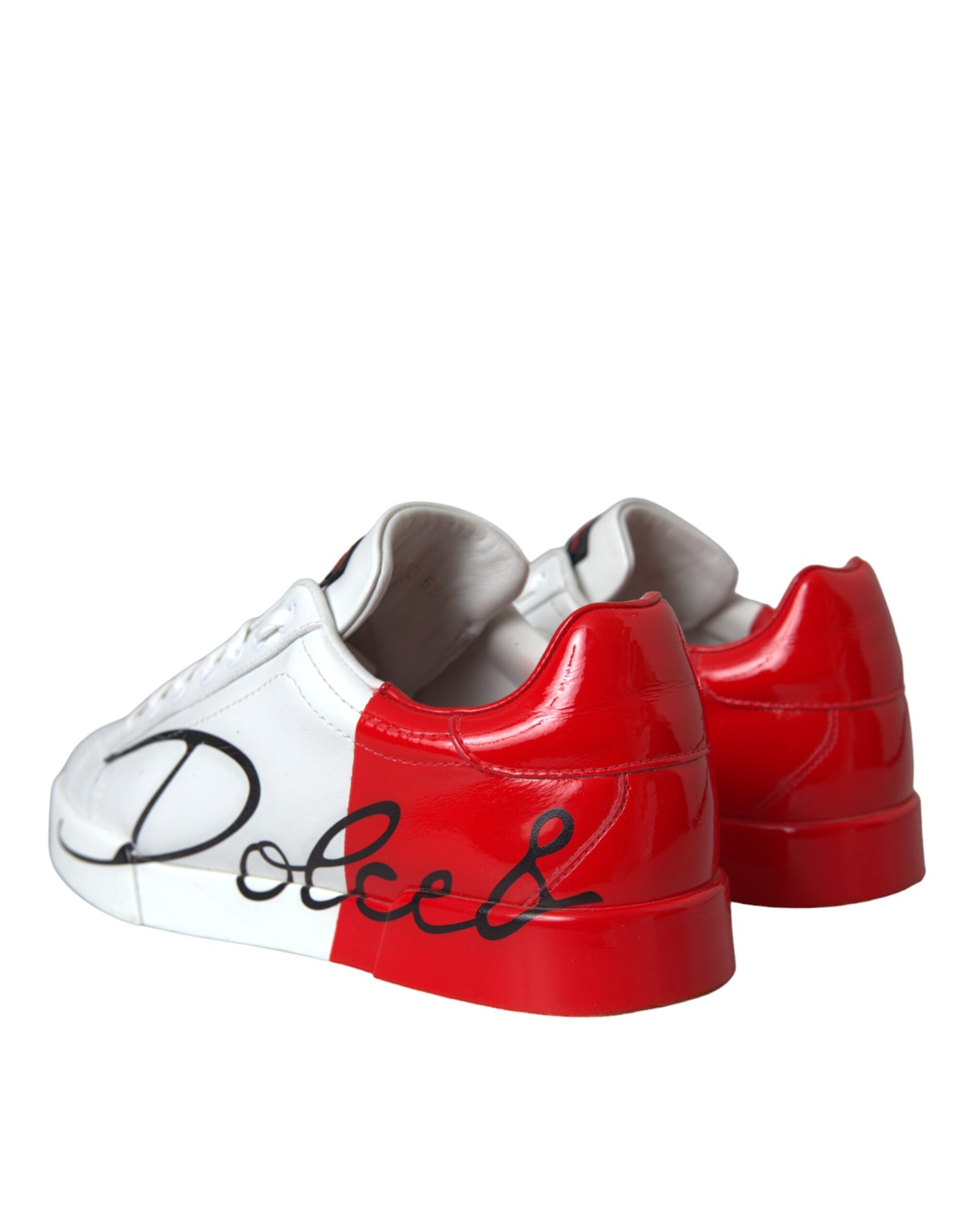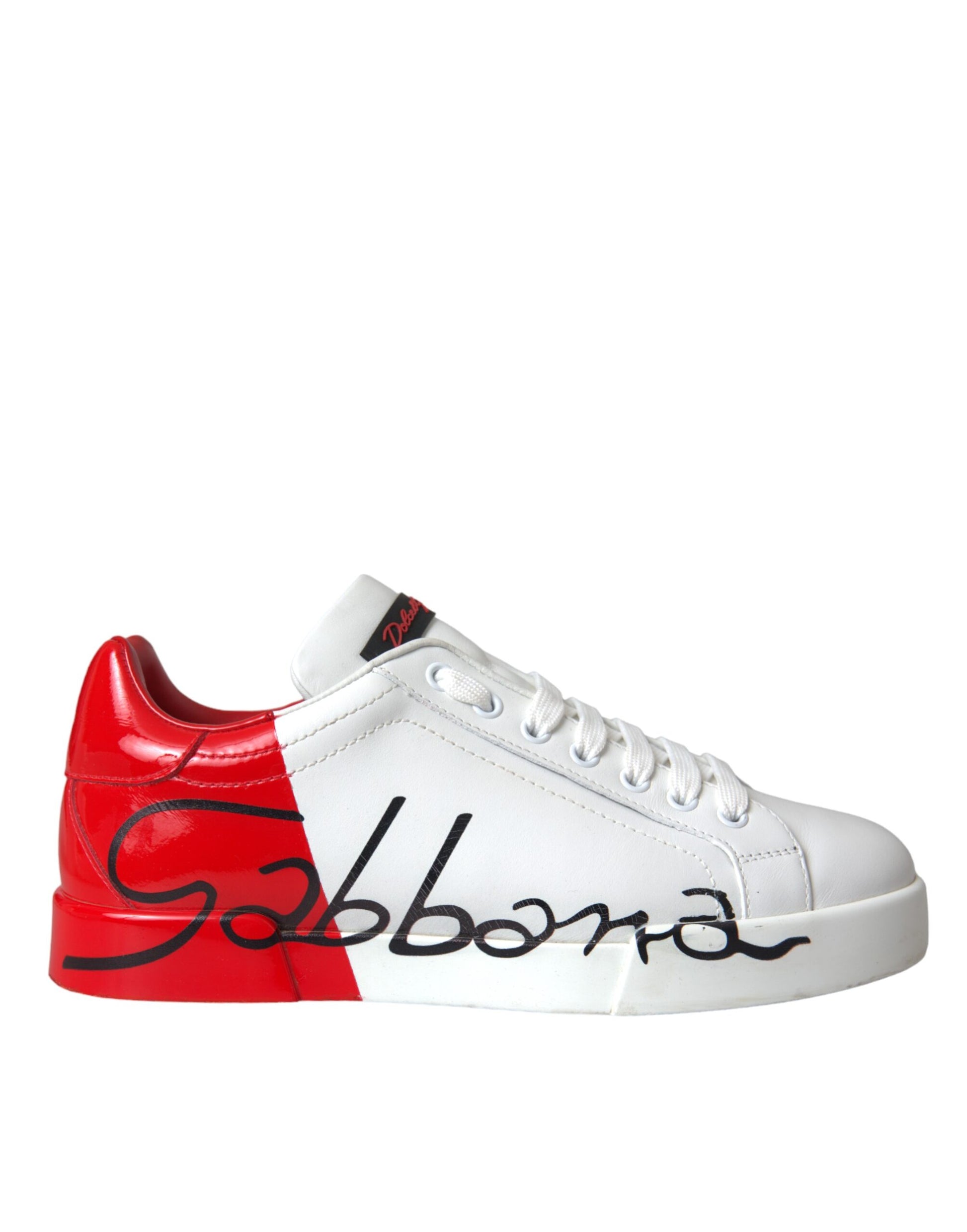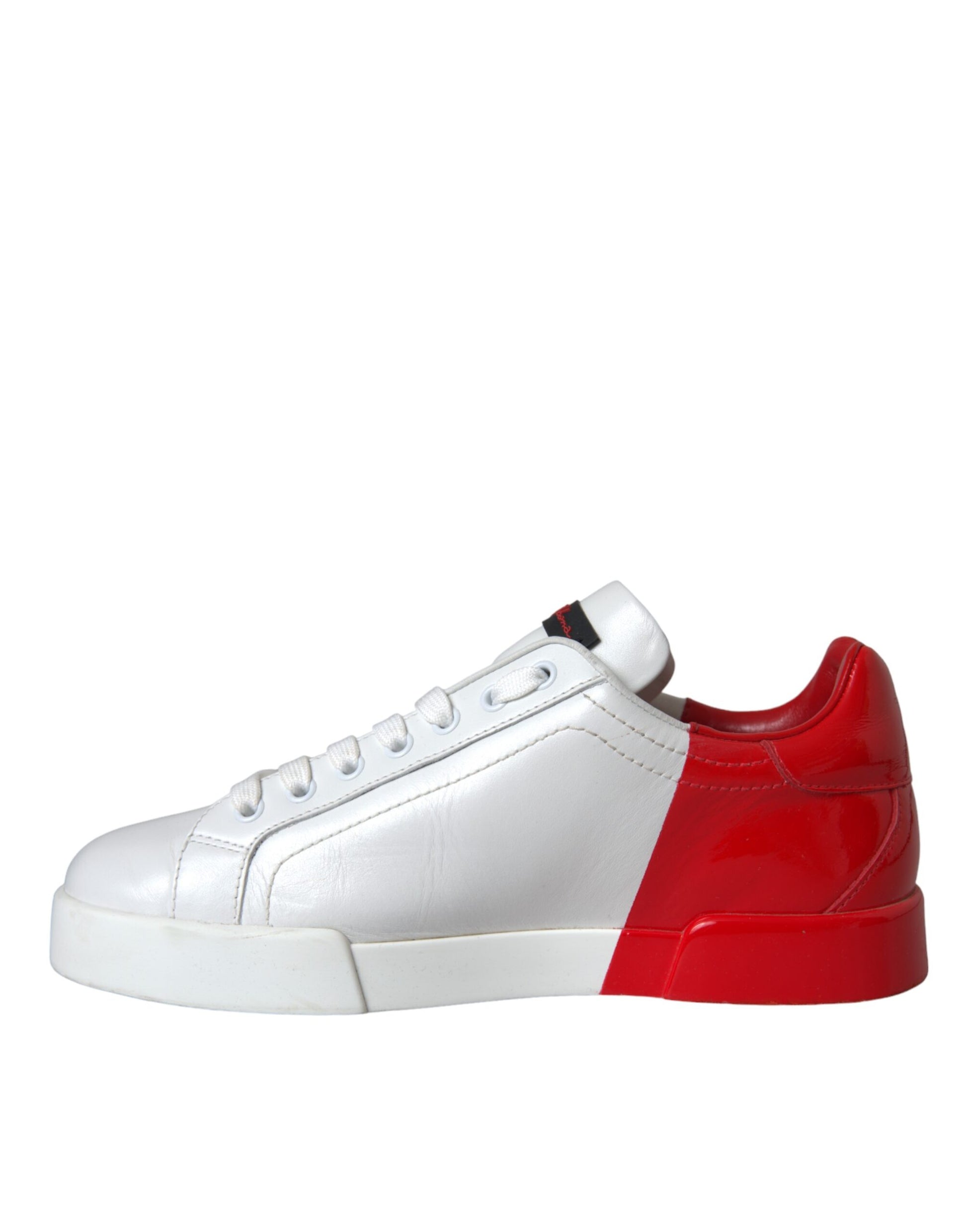 Gorgeous preowned with tags, 100% Authentic Dolce & Gabbana Portofino sneakers come with the brand name lettered on them. Made from leather in a red and white shade, they feature lace-up vamps, round toes, and comfortable rubber soles.
