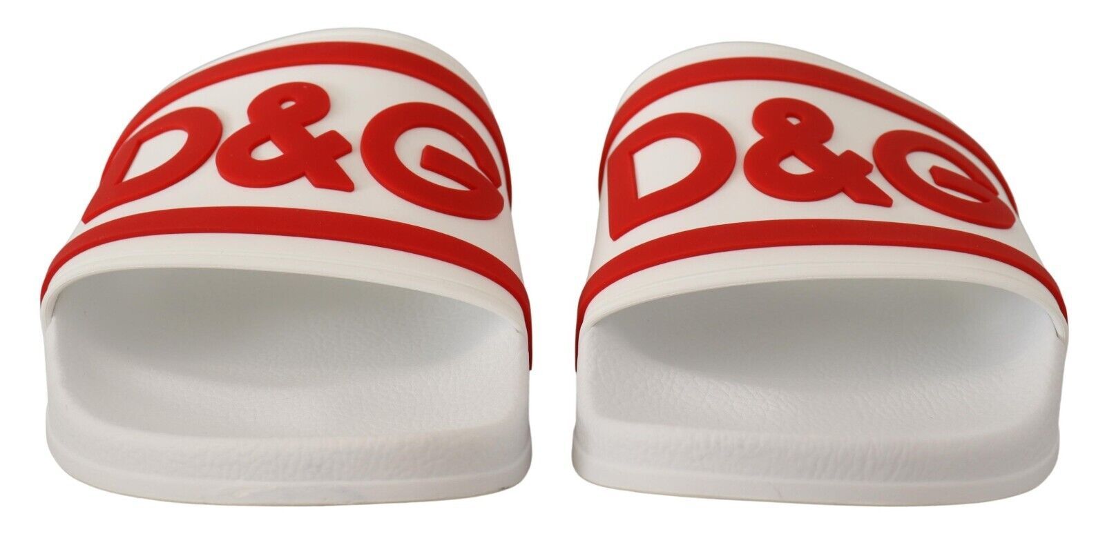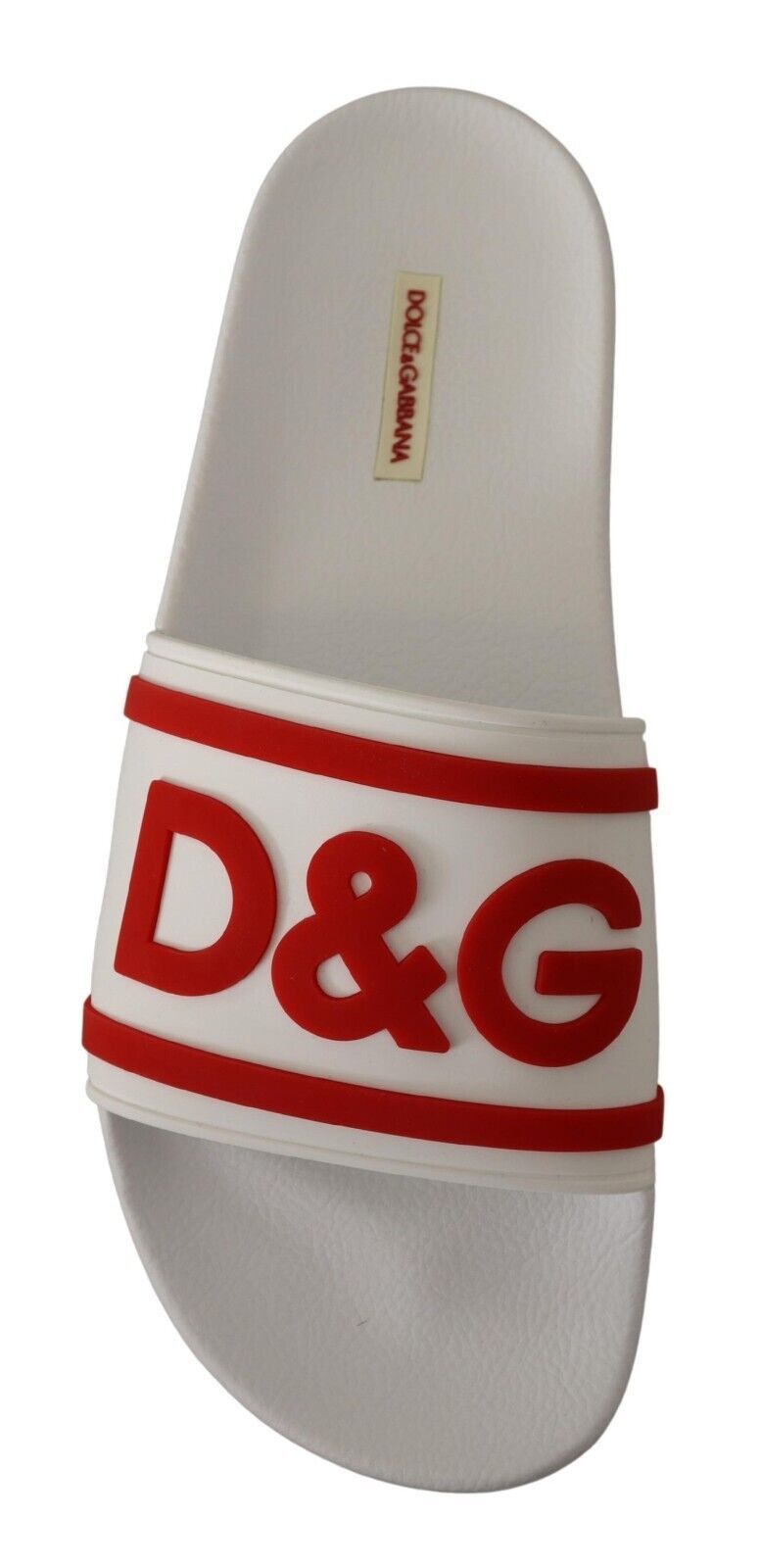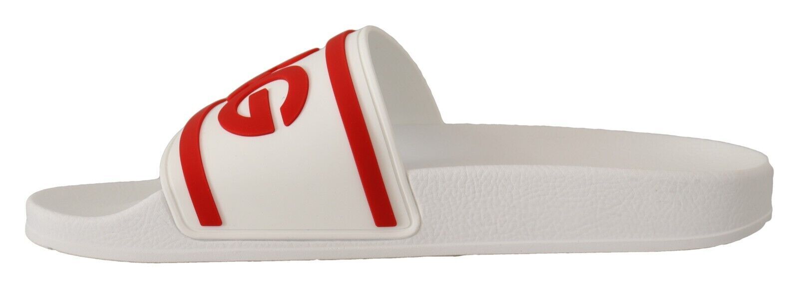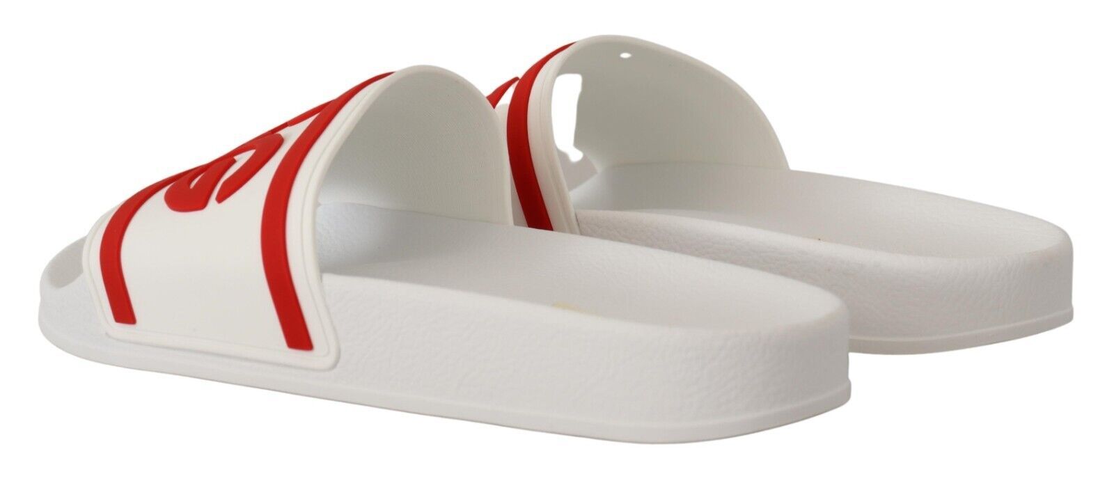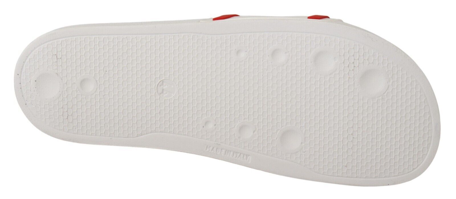 Step into luxury with these exquisite new-with-tags, 100% Authentic men’s slide sandals from Dolce & Gabbana. Flaunting a crisp white hue contrasted with a striking red logo, these Italian-made slides are the epitome of upscale leisurewear. Crafted from premium leather and set upon a durable rubber sole, they provide both comfort and style. The embossed logo details add an extra touch of class, making them a perfect choice for any discerning gentleman looking to elevate their summertime attire.