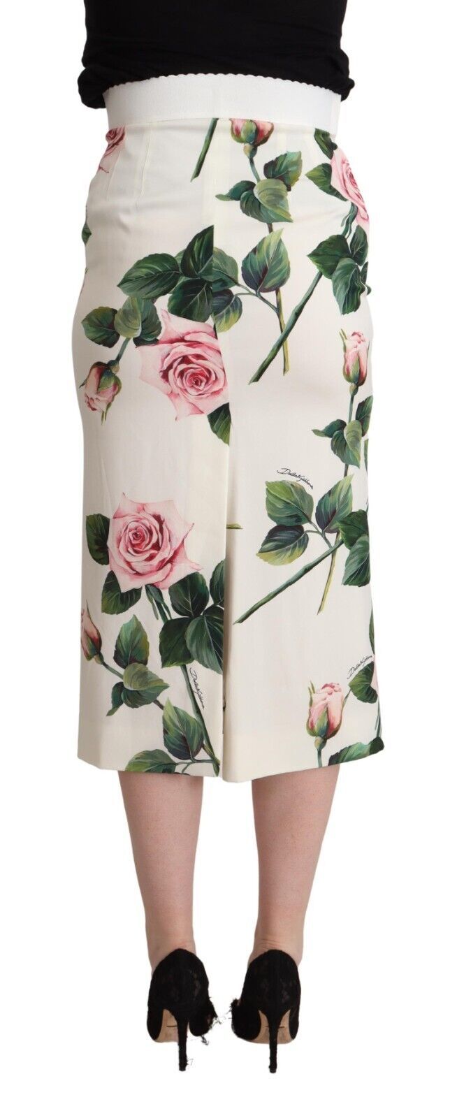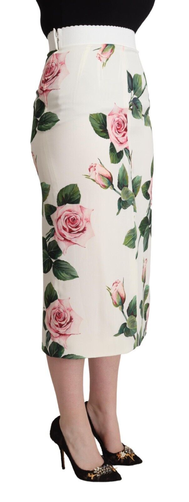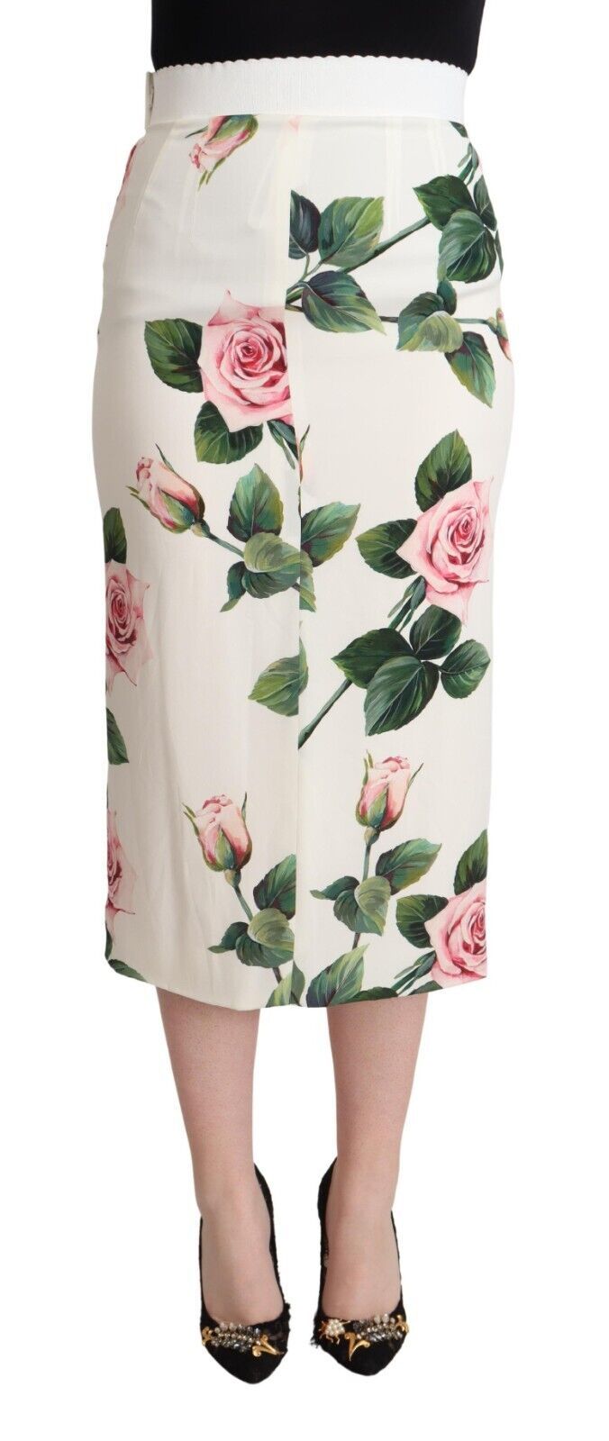 Indulge in the essence of Italian luxury with this exquisite pencil cut midi skirt by Dolce & Gabbana. The high waist design perfectly contours while the sophisticated rose print offers a timeless elegance. Ideal for a chic office look or a glamorous evening out.