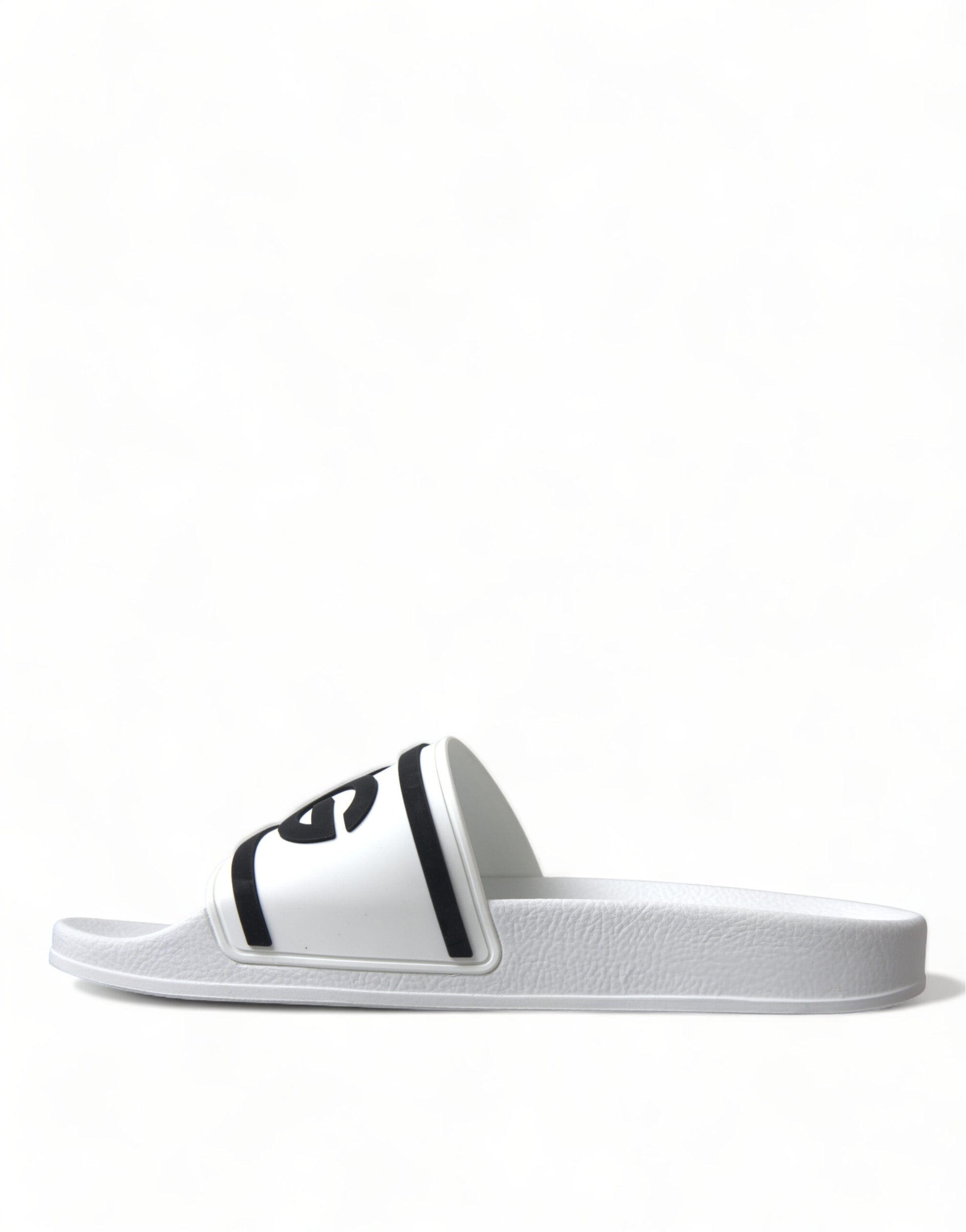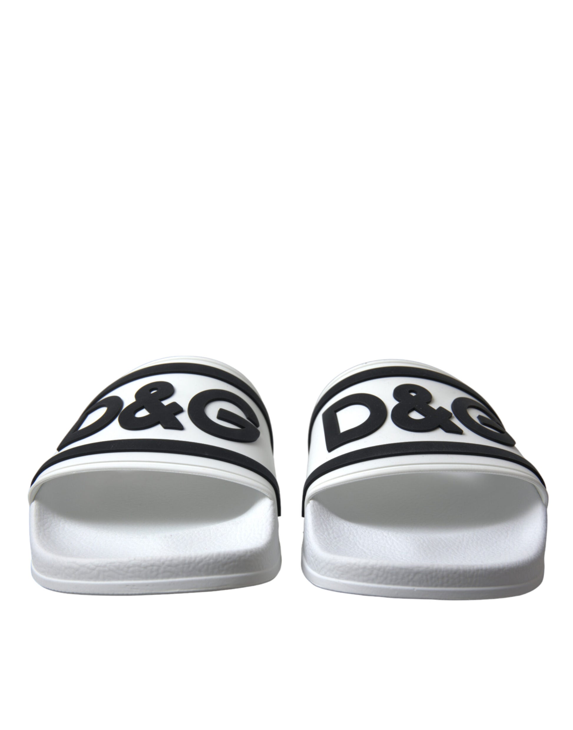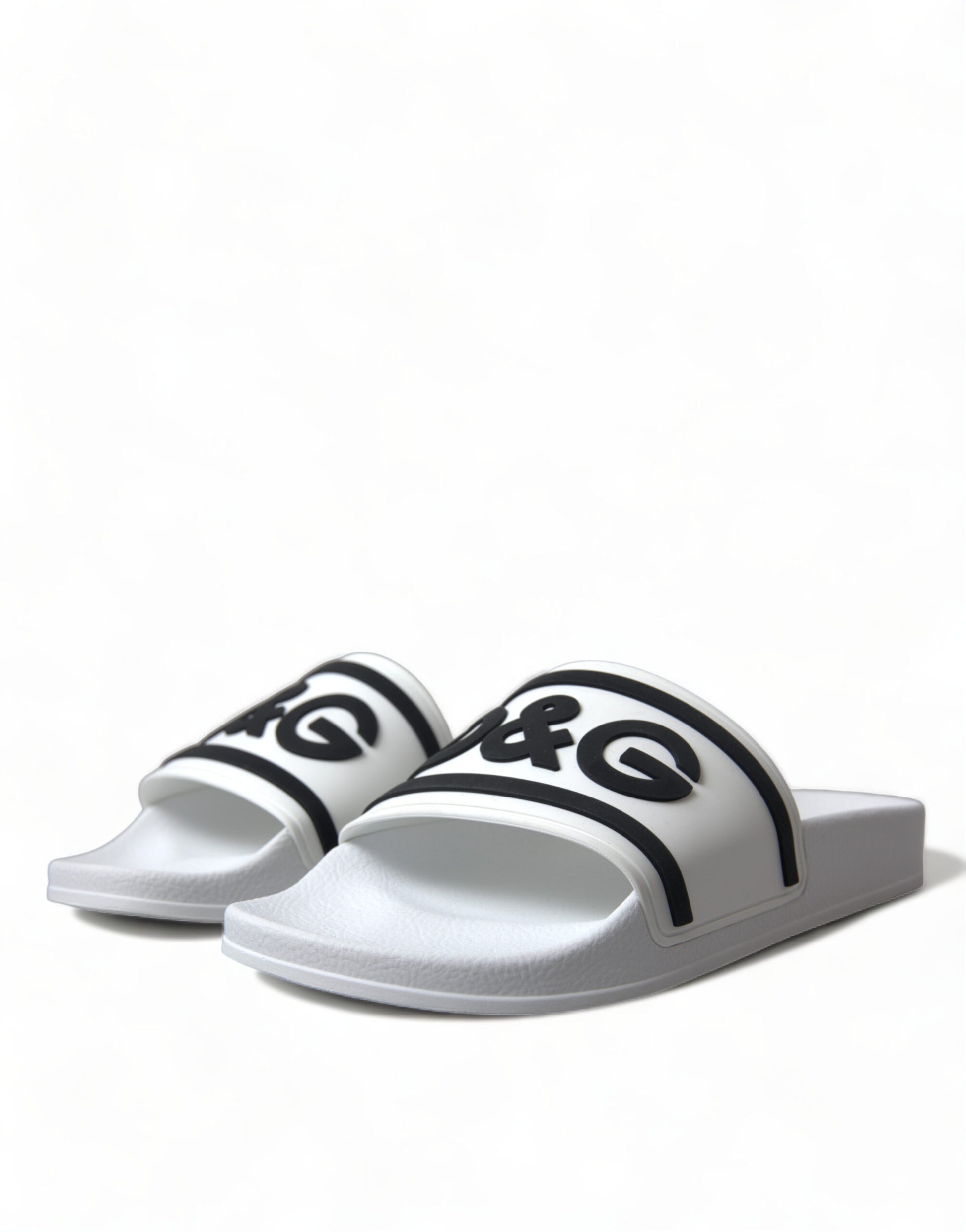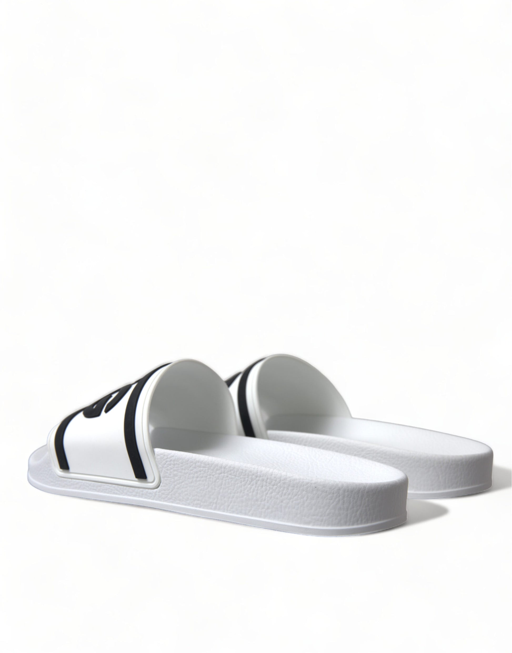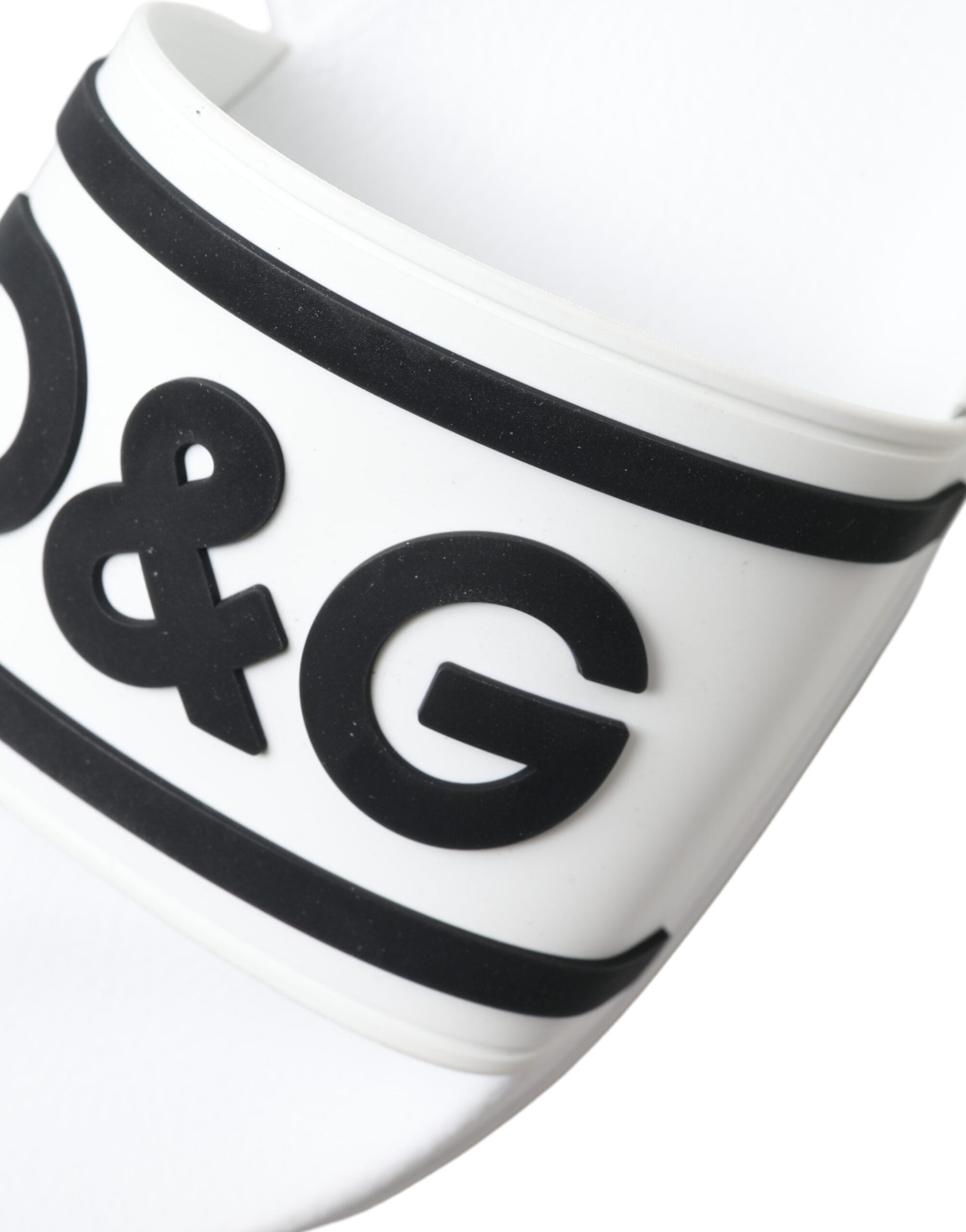 Step up your summer footwear with these Absolutely stunning, 100% Authentic Dolce & Gabbana slides. Their sleek white and black color scheme exudes elegance, while the brand’s signature logo print adds an unmistakable touch of luxury. Crafted from premium rubber, these lightsome sandals boast an extra-light rubber sole, embossed with the designer’s logo, promising style and comfort. Made in Italy, they are the quintessential choice for discerning fashion enthusiasts.