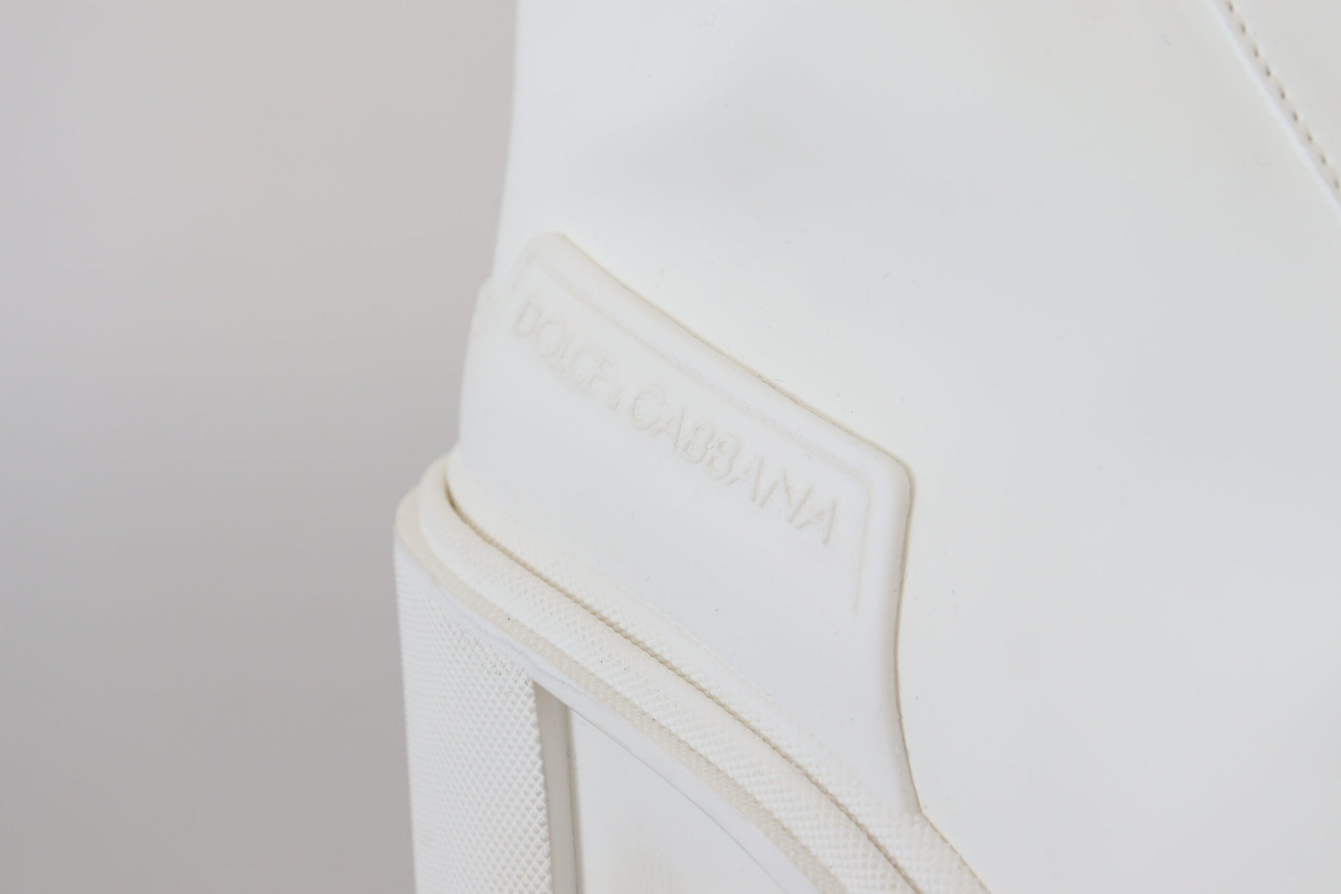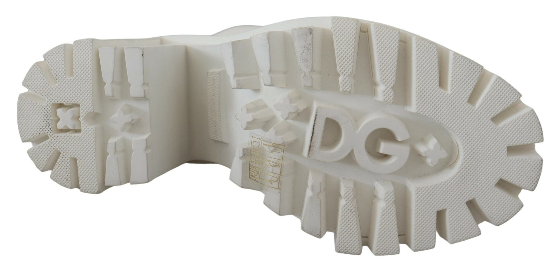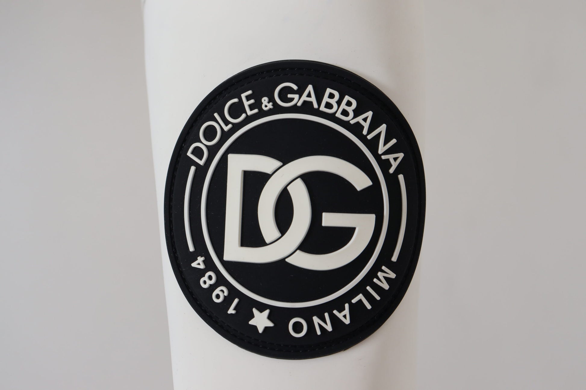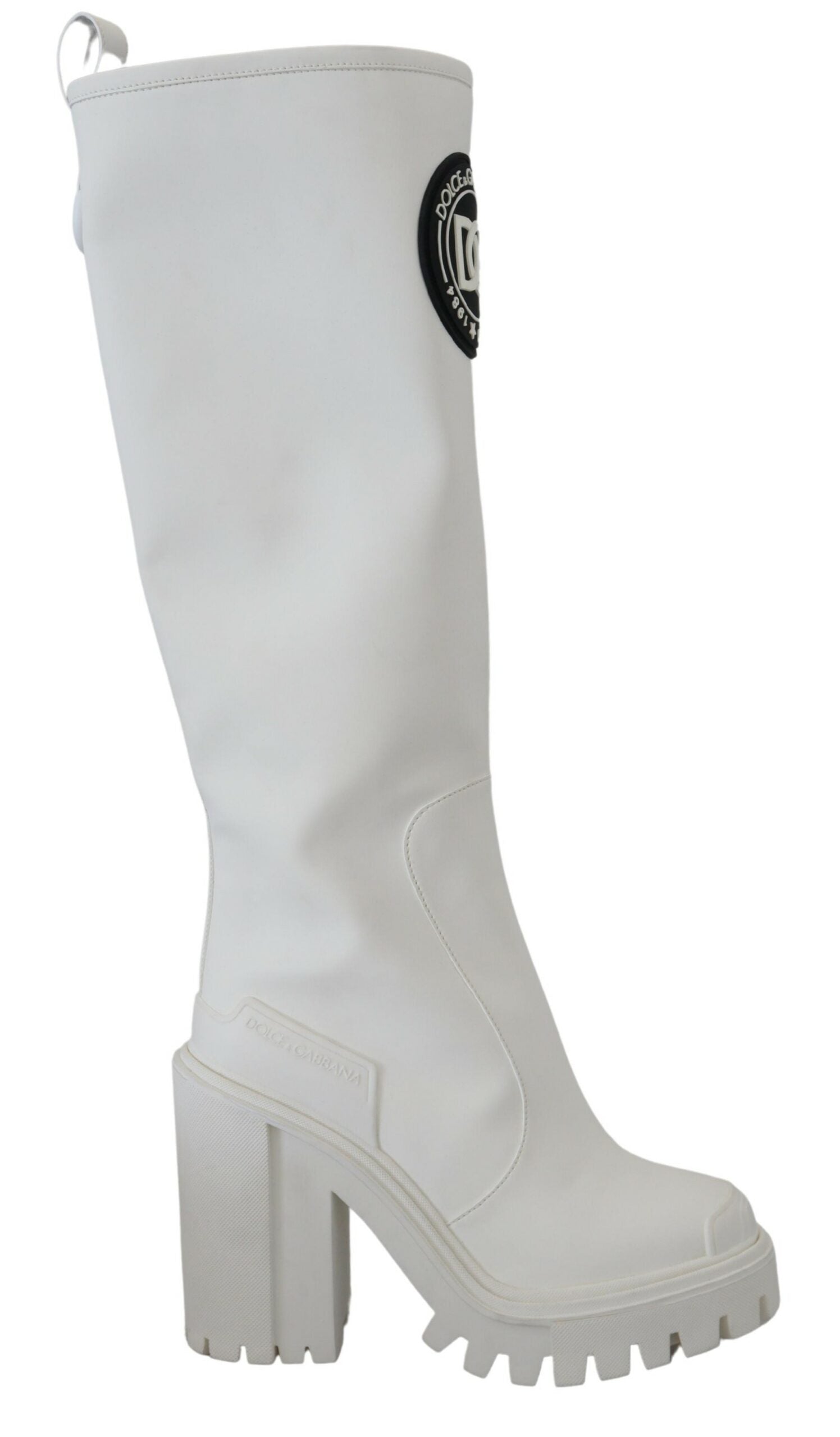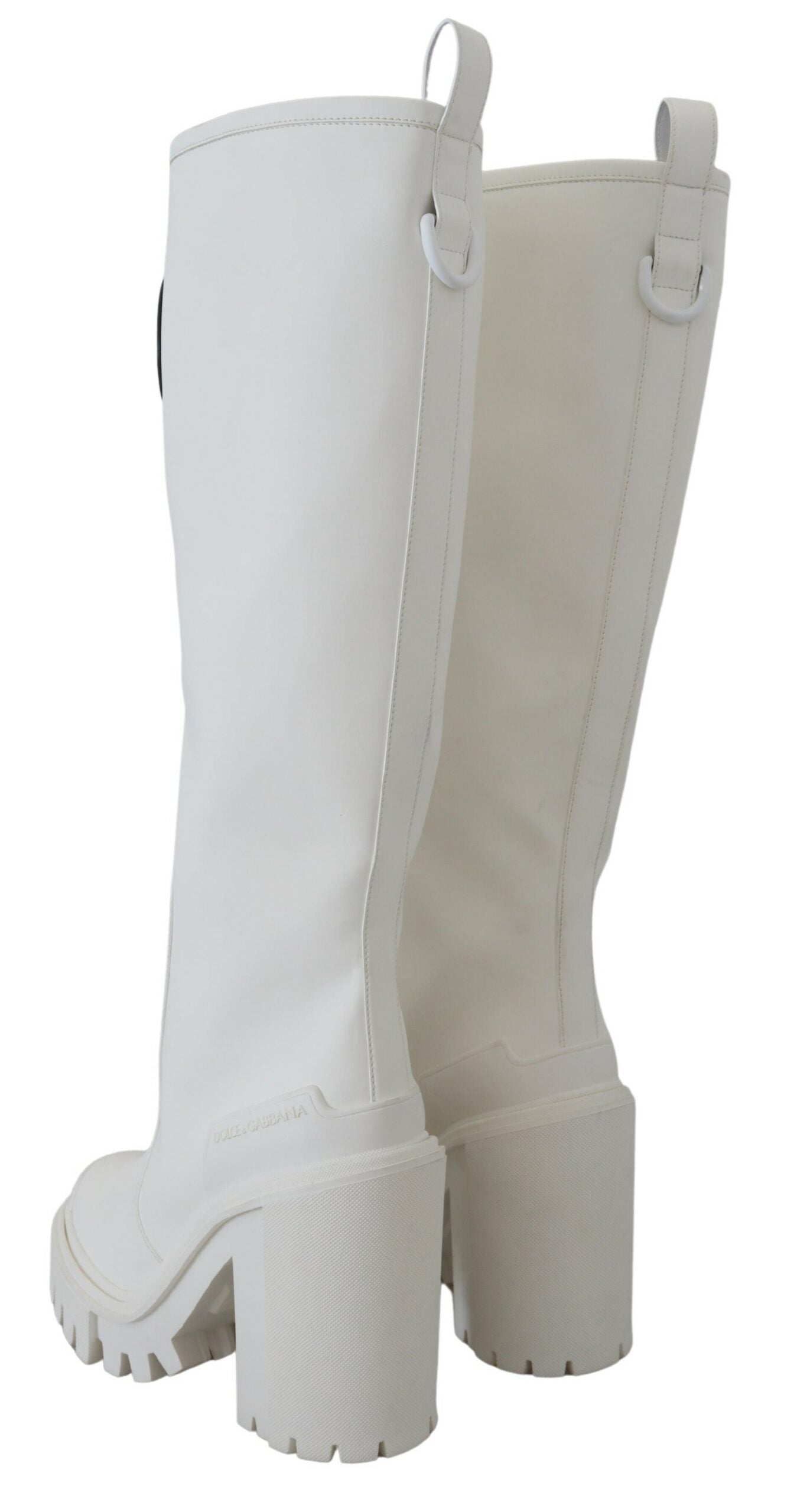 Step out in sophisticated style with these luxurious white leather knee boots from Dolce & Gabbana. Meticulously crafted in Italy, they feature a unique rubbery effect and the brand’s iconic logo for a touch of elegance. The solid color design is embellished with appliqués, shaping a classic round toe-line. Indulge in the comfort of leather lining and a sturdy square heel, all set atop a durable rubber sole. Perfect for elevating any ensemble with a tasteful statement piece that embodies high quality and unmatched comfort.