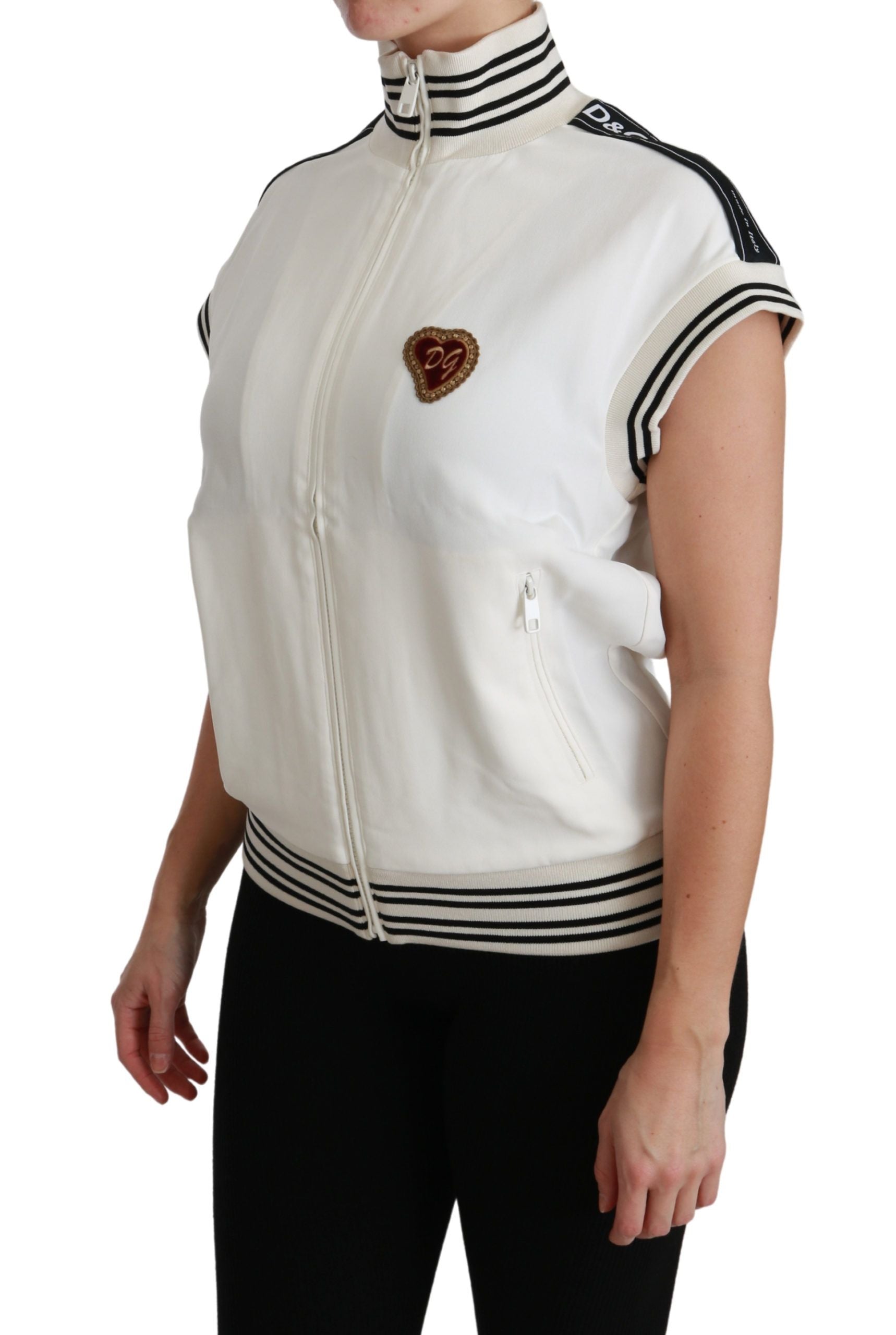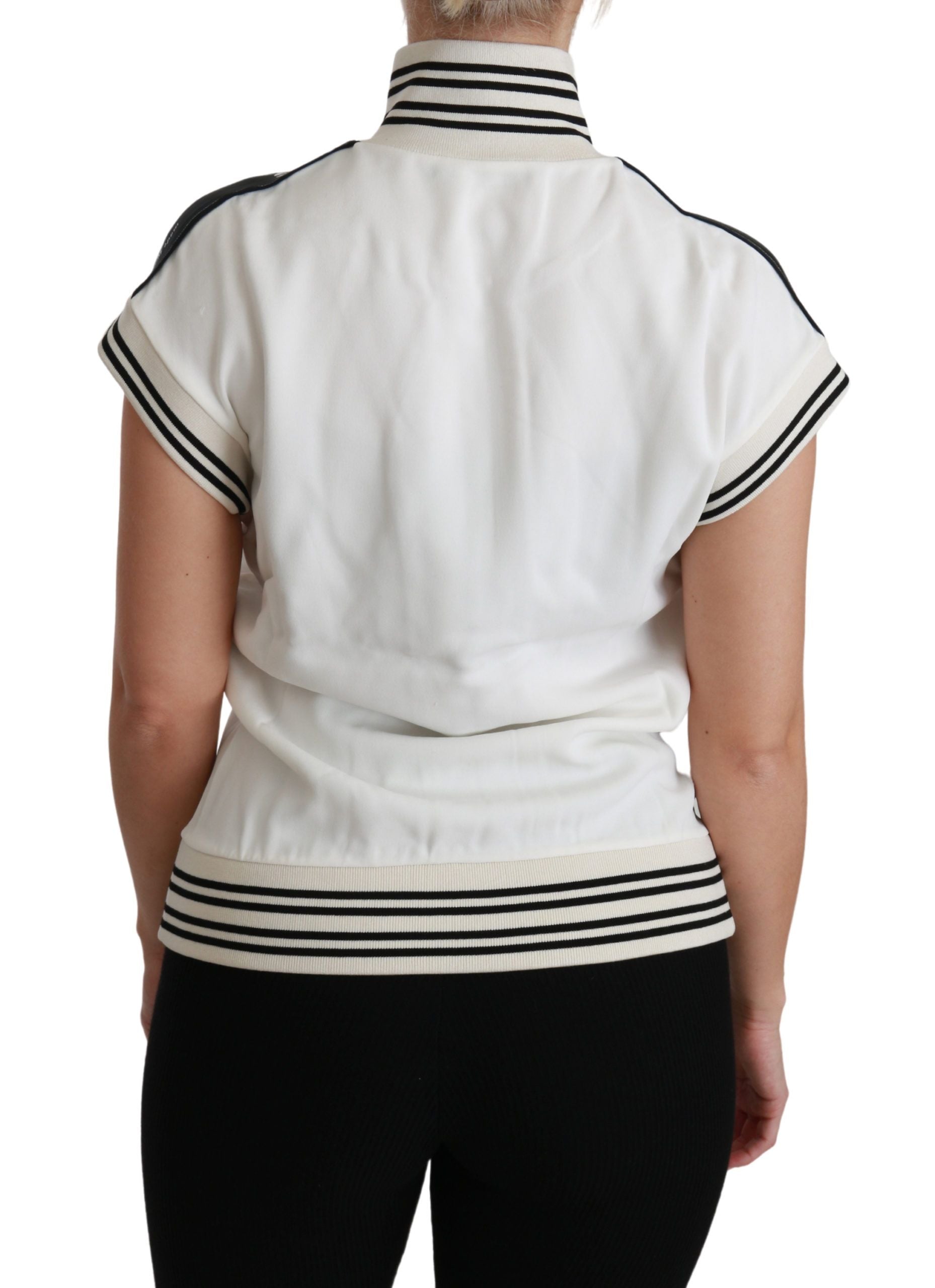 Step out in opulent style with this Dolce & Gabbana sweater adorned with a Sacre Cuore motif and delicate crystal embellishments. Crafted with high craftsmanship in Italy, this sweater features a full zipper and short sleeves, making it a perfect blend of sophistication and comfort. Its luxurious composition and chic white color provide an exclusive touch to your wardrobe.