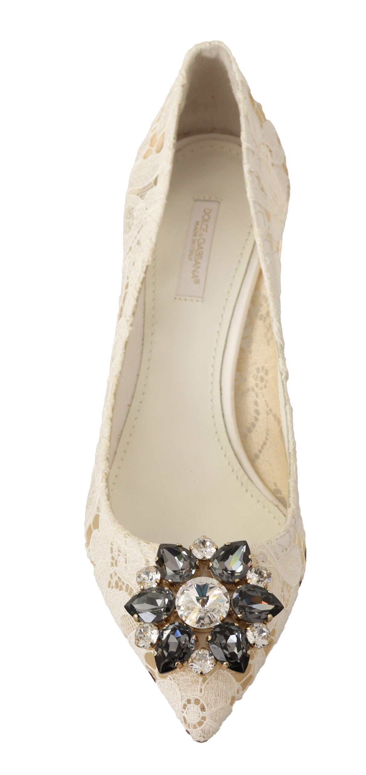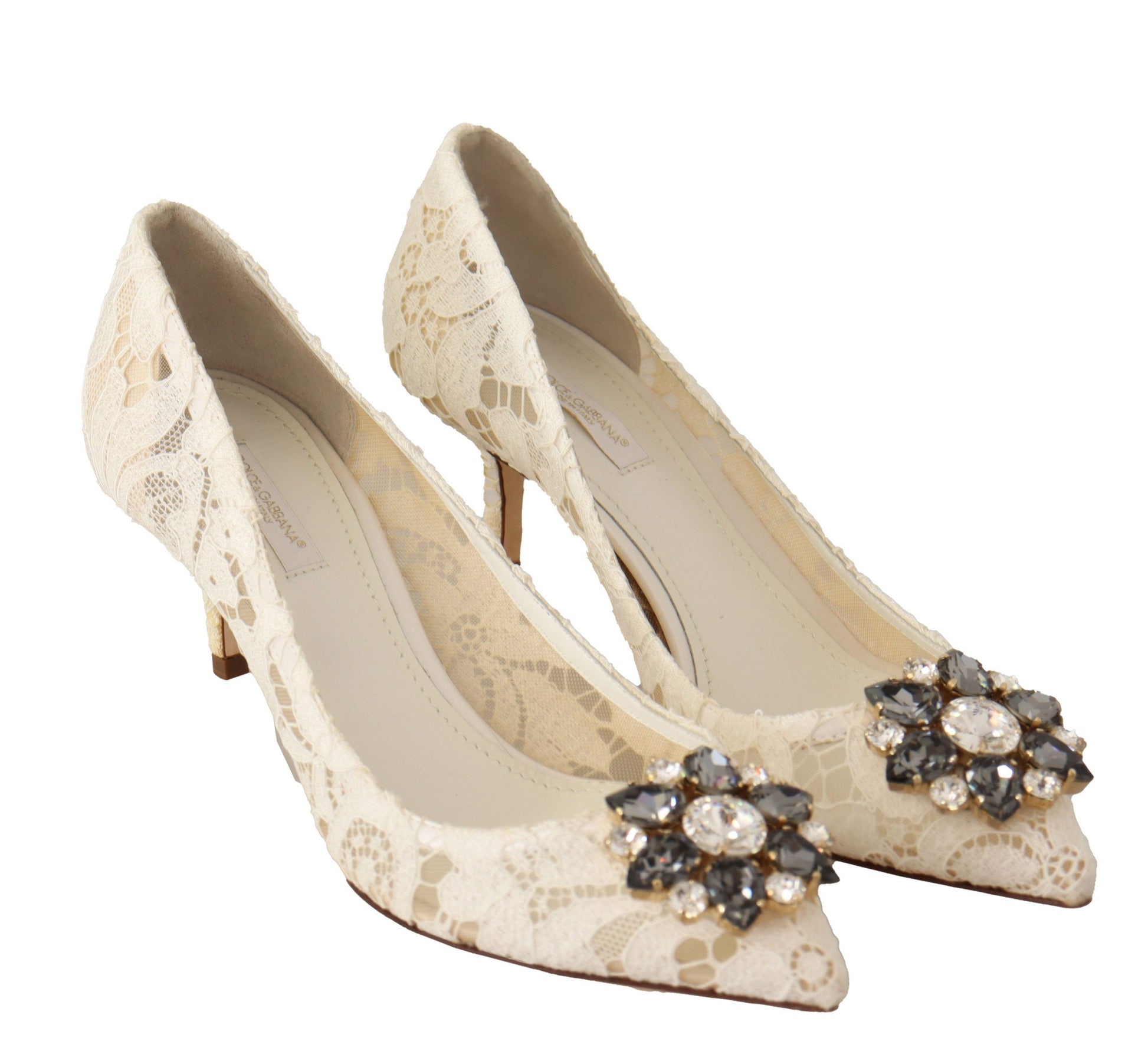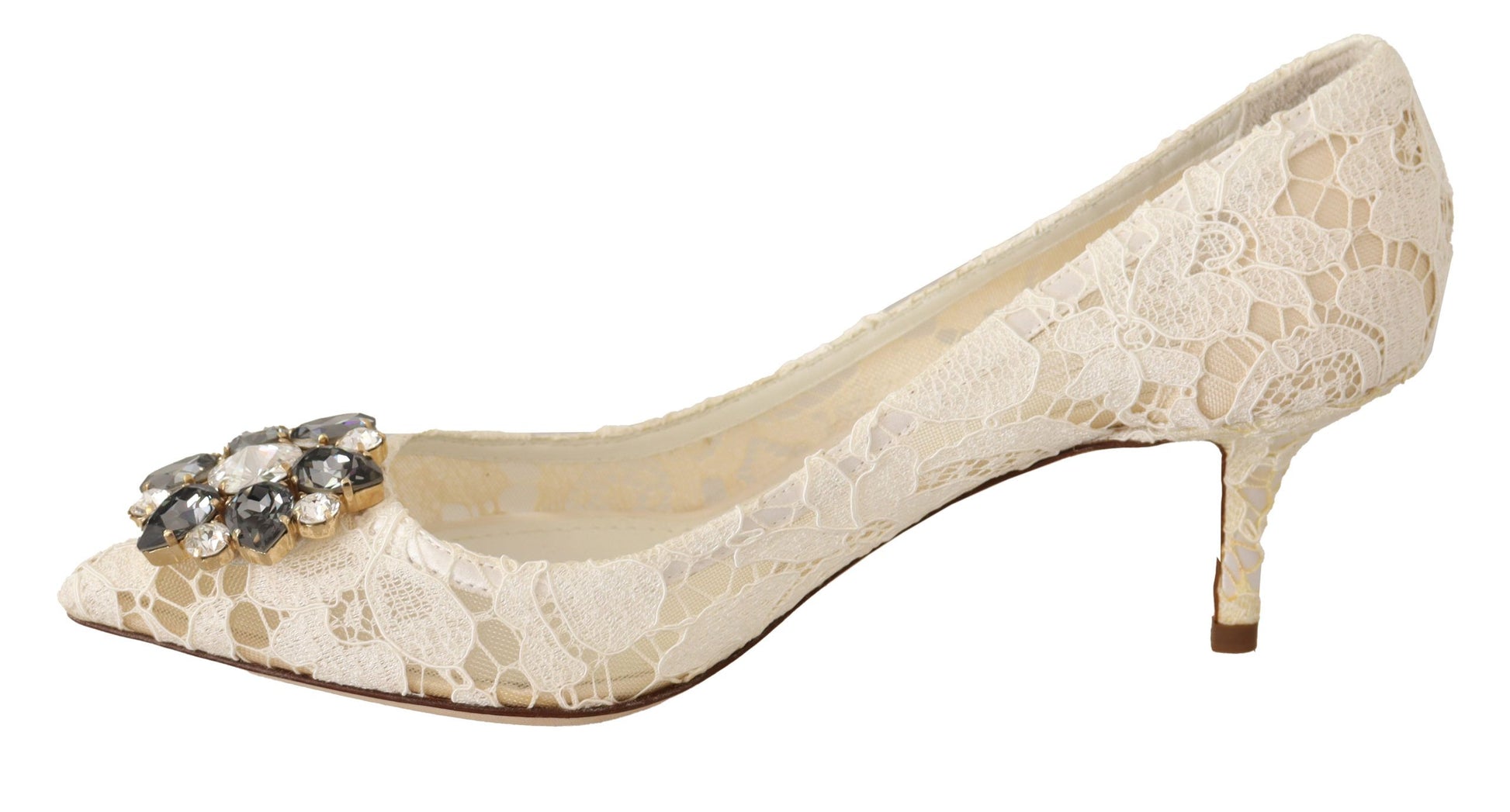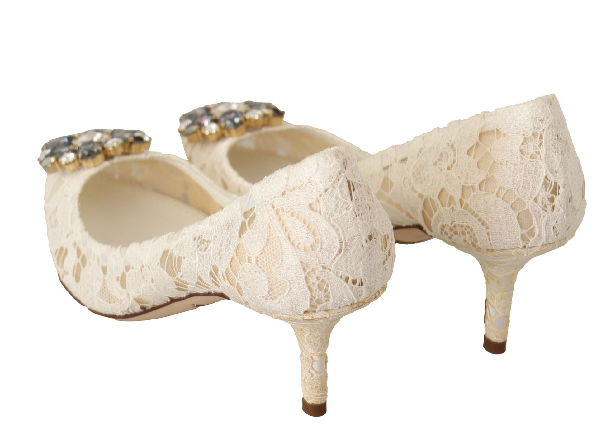 Step into luxury with these exquisite Dolce & Gabbana taormina lace heels, perfect for making a sparkling statement. With intricate crystals adorning the elegant white lace, these pumps from the Rainbow collection are a testament to timeless style and Italian craftsmanship. A leather bottom sole provides durability, while the logo detailing ensures brand recognition. Whether for a bridal event or an opulent evening affair, these heels are sure to dazzle.