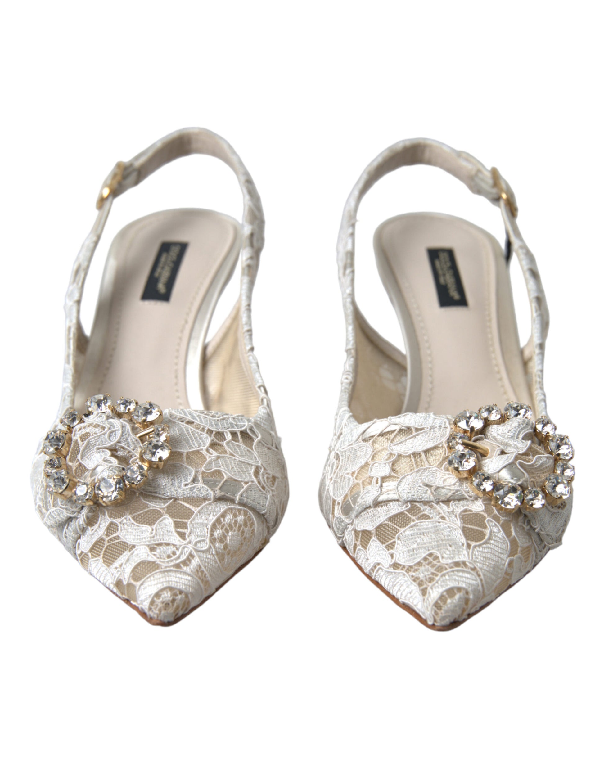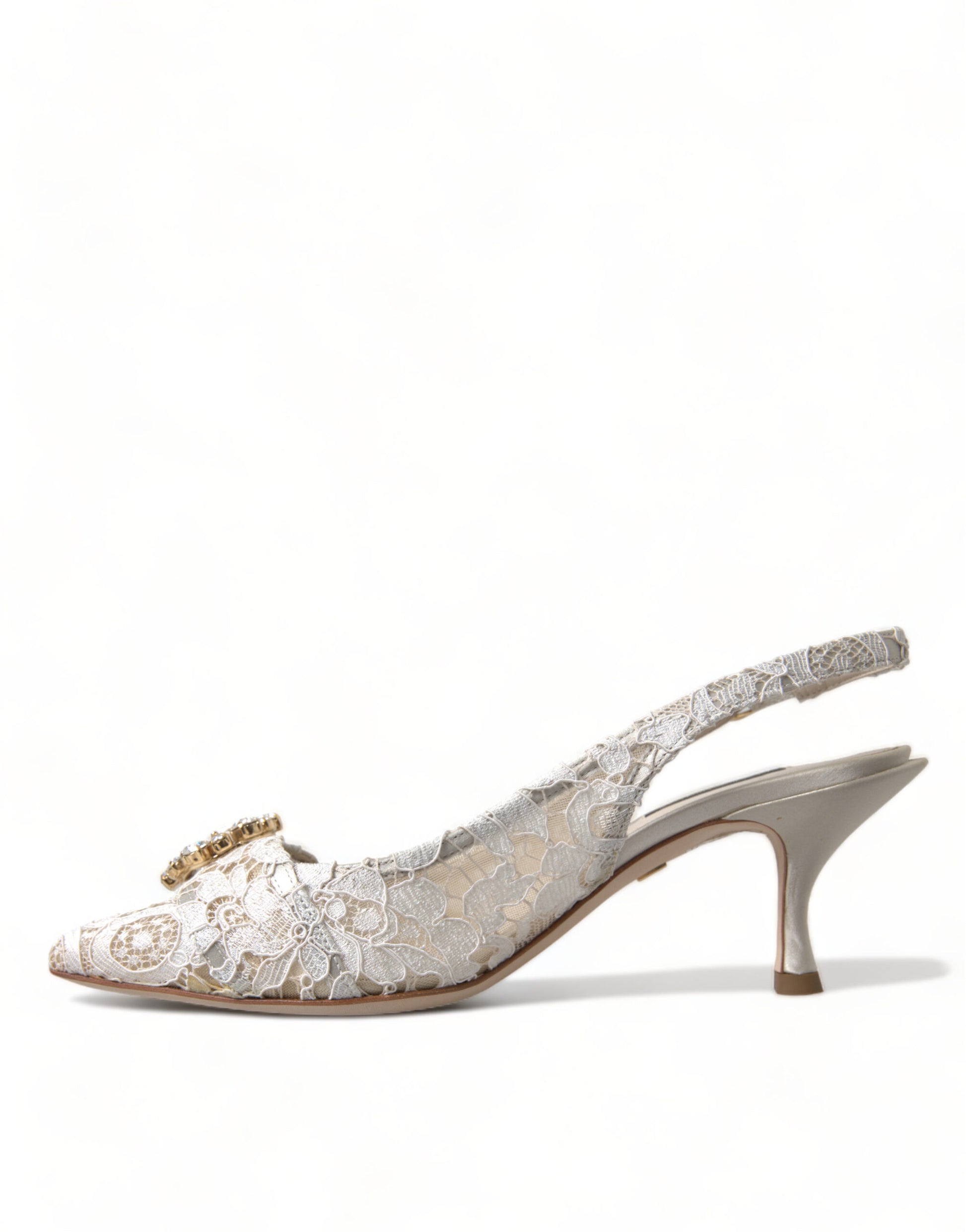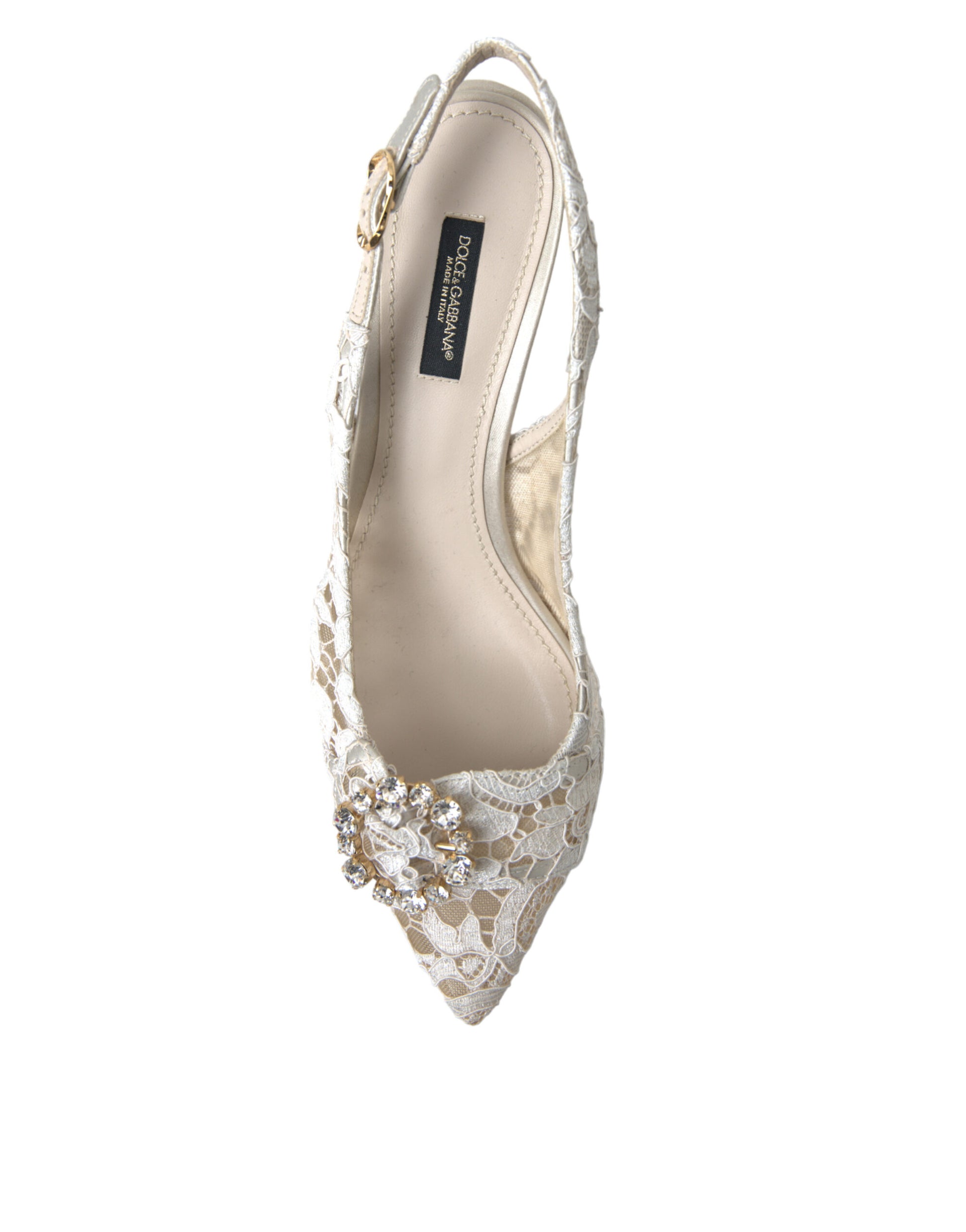 Indulge in the exquisite elegance of these Dolce & Gabbana Taormina lace slingback heels. Accentuated with sparkling white crystals, these heels exude sophistication and glamour, perfect for making a statement at any upscale event. Crafted in Italy with an off-white lace overlay, they feature a comfortable leather bottom sole and the iconic logo detail, promising both style and luxury.