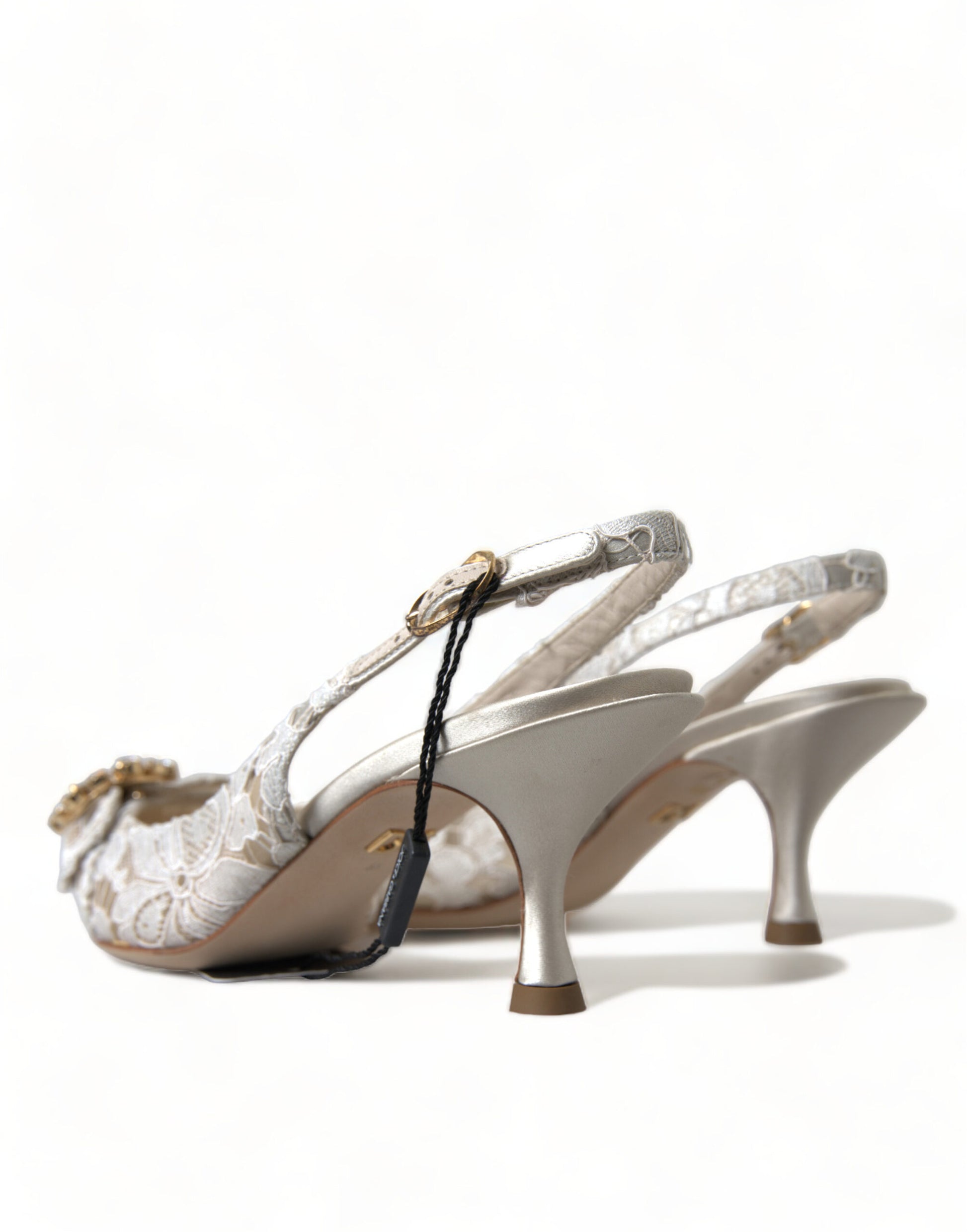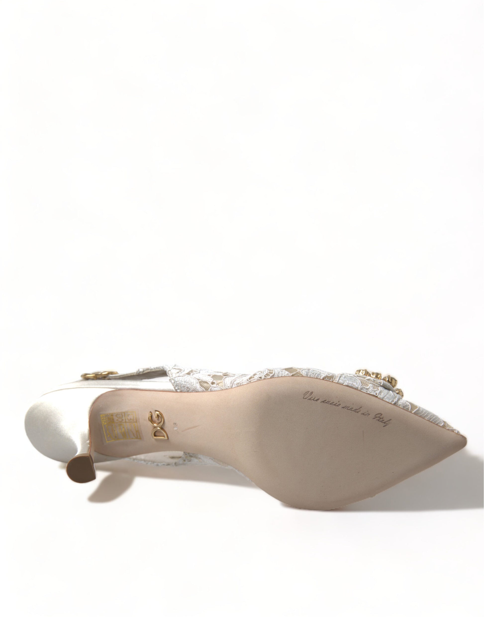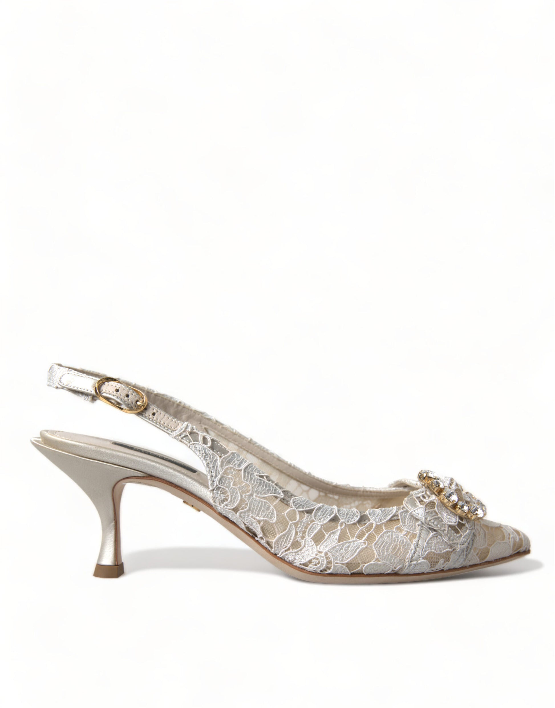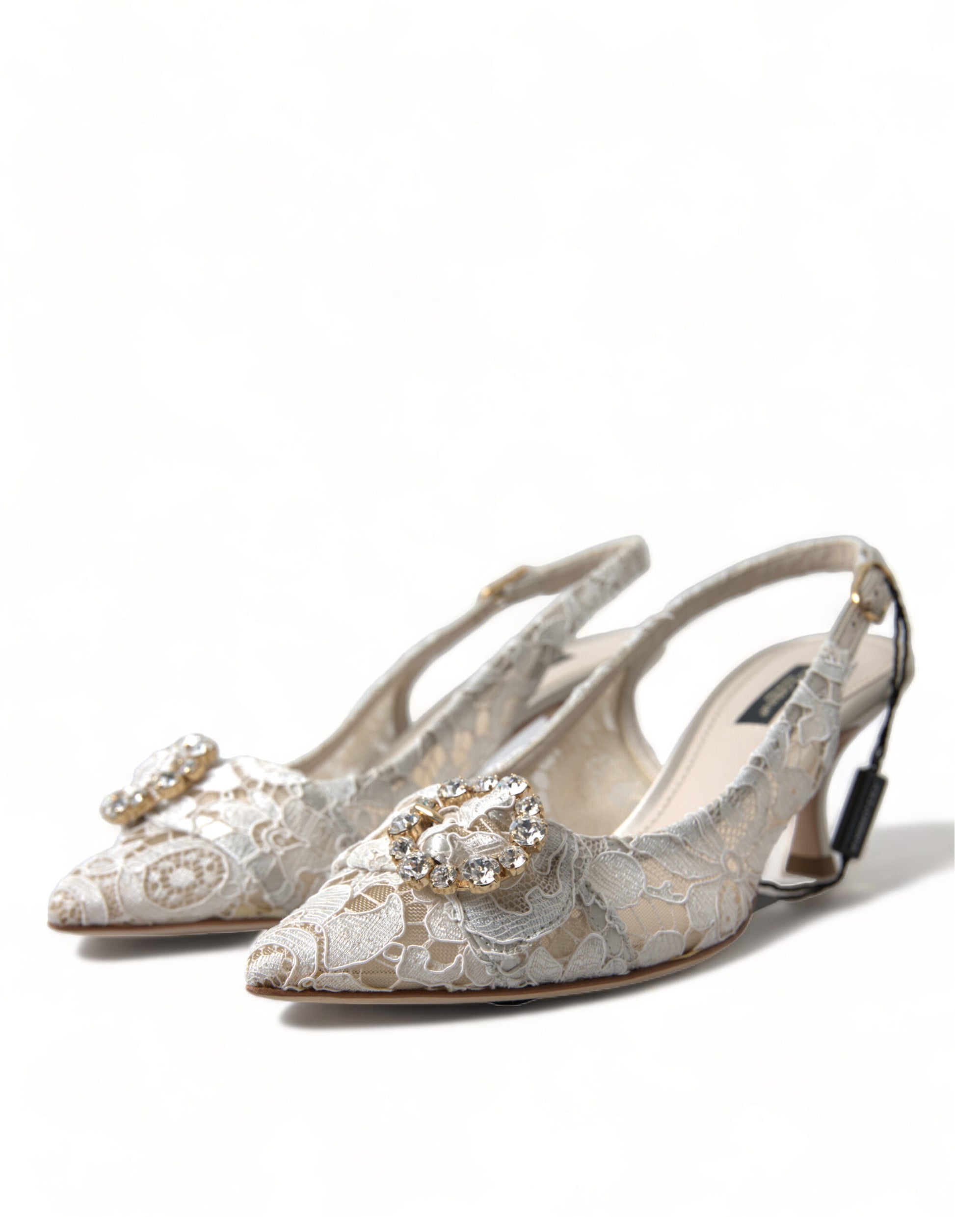 Indulge in the exquisite elegance of these Dolce & Gabbana Taormina lace slingback heels. Accentuated with sparkling white crystals, these heels exude sophistication and glamour, perfect for making a statement at any upscale event. Crafted in Italy with an off-white lace overlay, they feature a comfortable leather bottom sole and the iconic logo detail, promising both style and luxury.