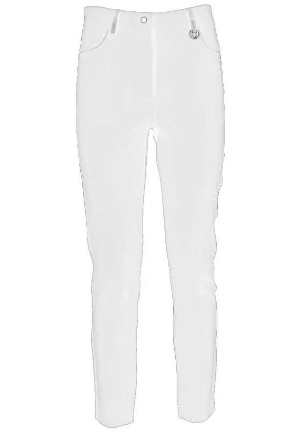 Experience the perfect blend of sophistication and comfort with our chic slim-fit trousers in a pristine white hue. Crafted for those who appreciate the sartorial elegance of Milano stitch, these five-pocket trousers are designed to create a sleek silhouette. Versatility at its best, they are suitable for a variety of occasions, seamlessly transitioning from daytime commitments to evening affairs.