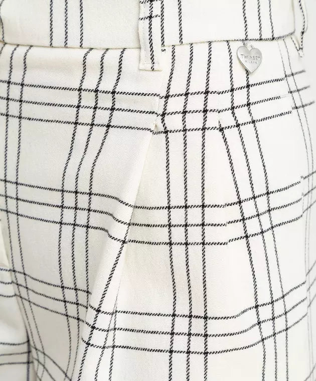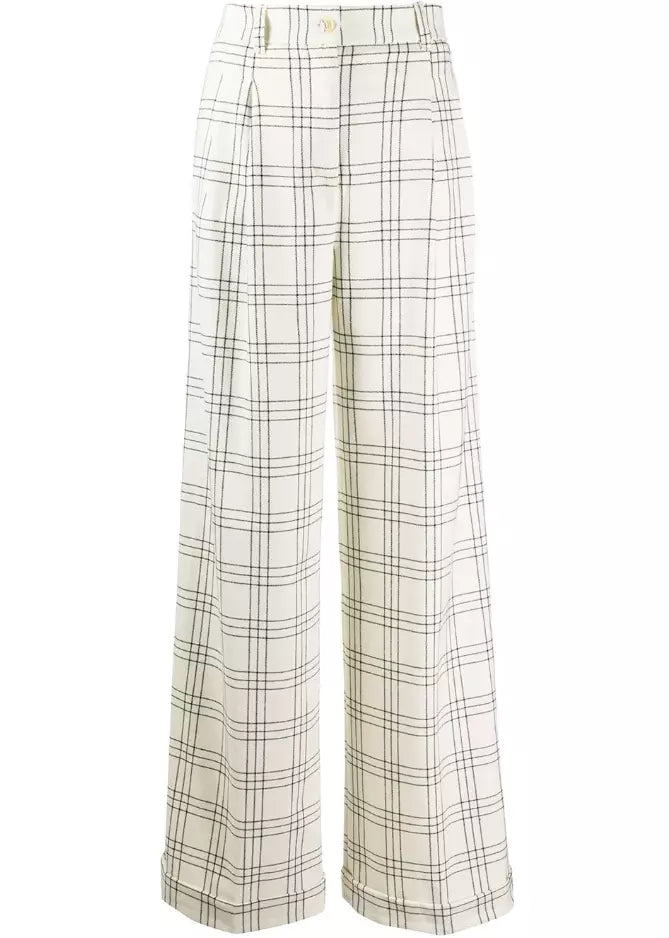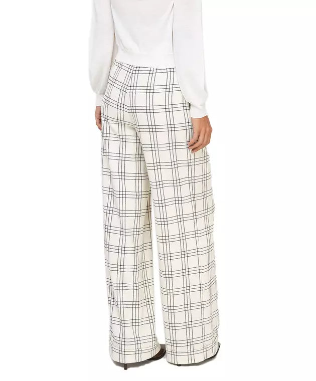 Embrace elegance and comfort with these white wide-leg trousers, crafted from a luxurious wool blend featuring a contrasting check pattern. The perfect blend of style and sophistication for any fashion-forward wardrobe.