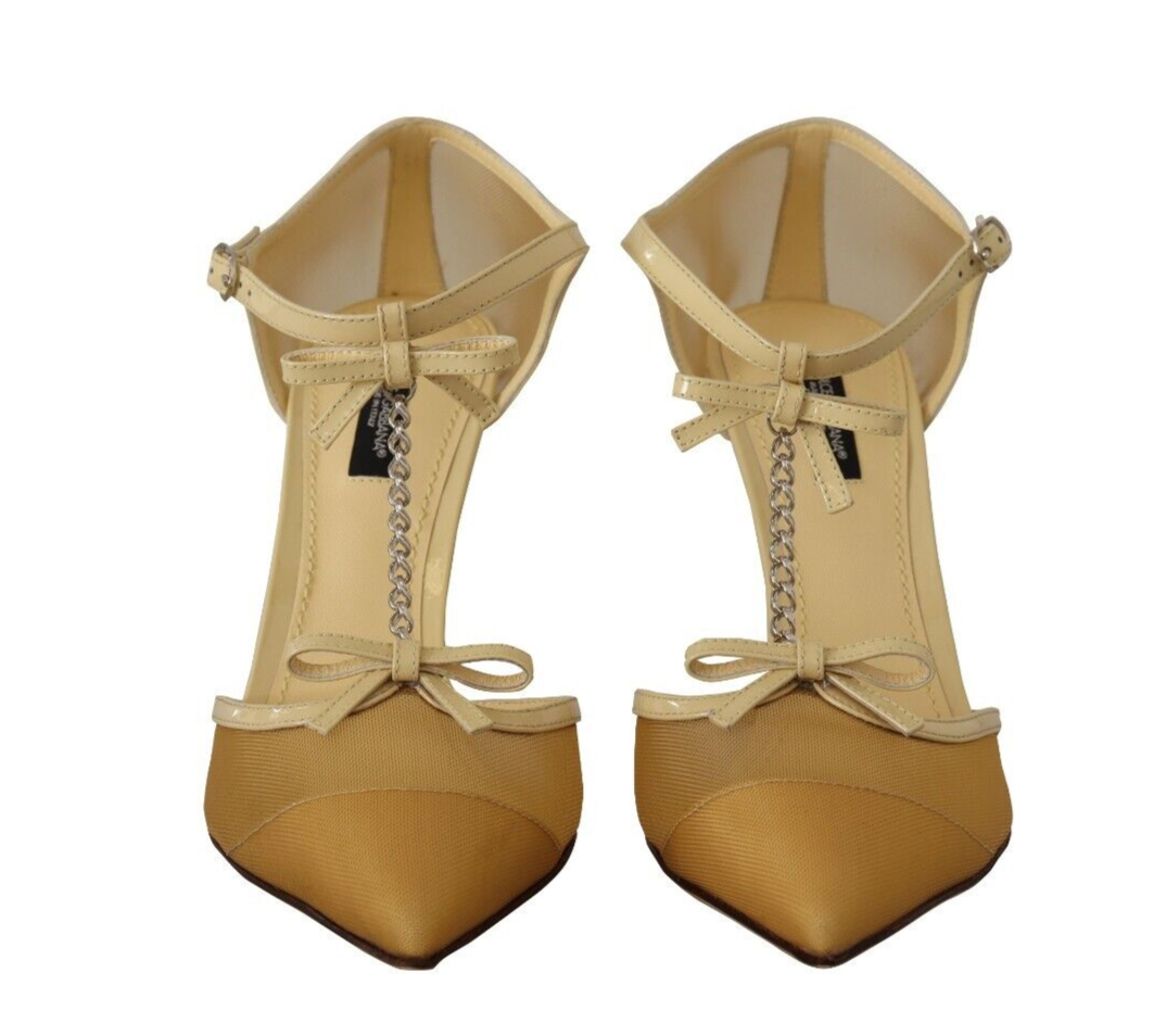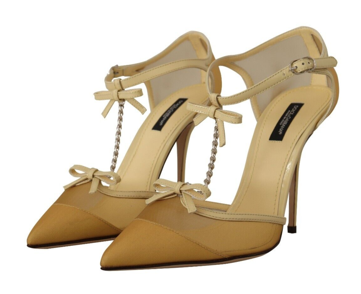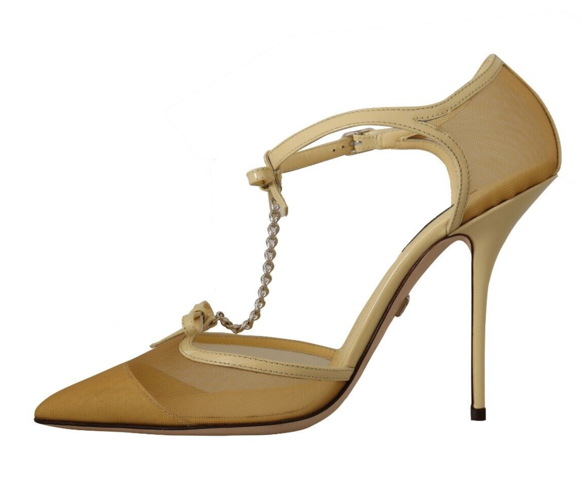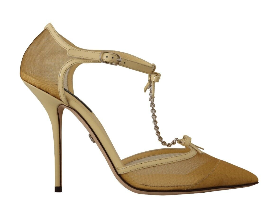 Step into luxury with these stunning Yellow Mesh T-Strap Pumps from world-renowned designer Dolce & Gabbana. Perfect for elevating any outfit, these heels boast a sleek pointed toe and high stiletto heel for a dramatic and elegant silhouette. Each pair is a testament to Italian craftsmanship, designed for both high quality and comfort.