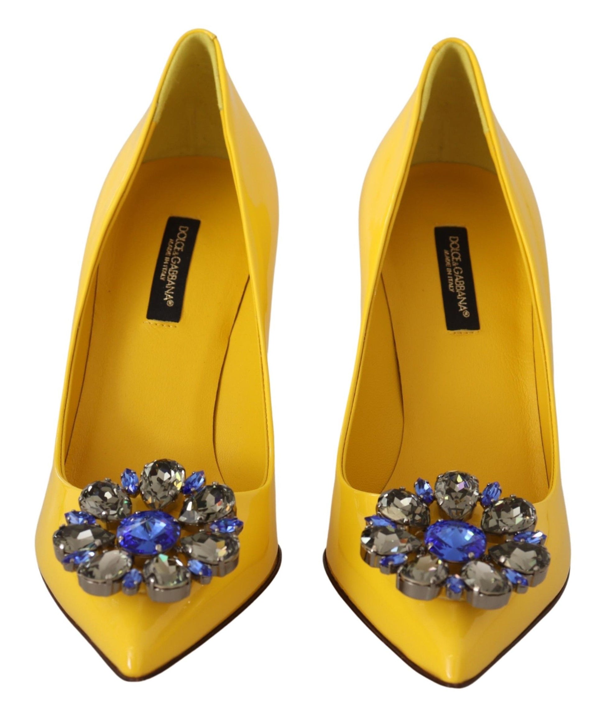 Step into a world of unparalleled elegance with these brand new Sunshine Yellow Leather Pumps. Adorned with sparkling blue-gray crystals, these Dolce & Gabbana heels are the epitome of luxurious fashion. Crafted from 100% patent leather with a leather sole, these classic heels offer both supreme quality and comfort. Perfect for any glamorous occasion, these Made in Italy pumps will light up any ensemble.