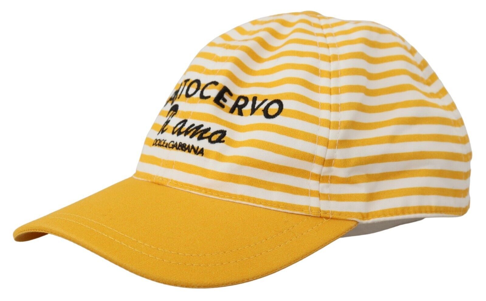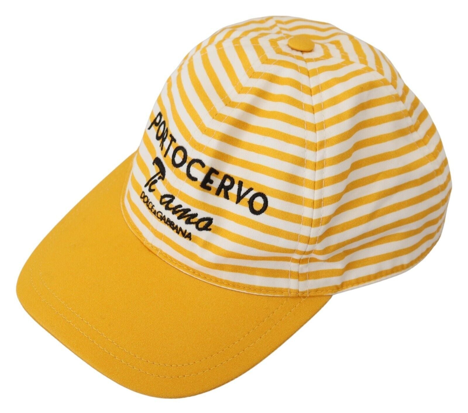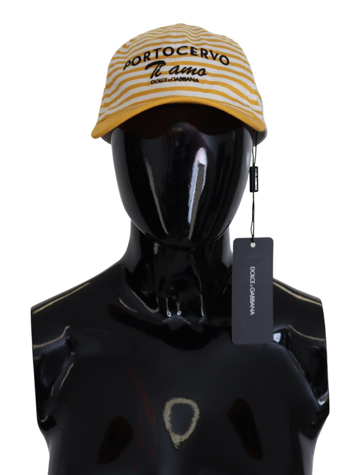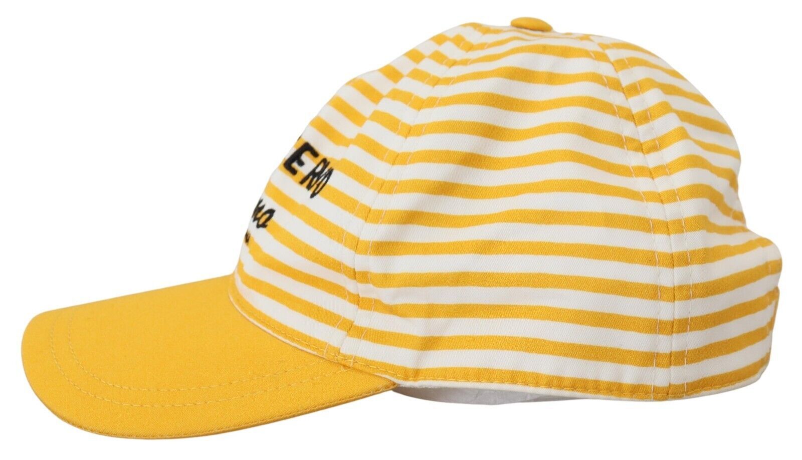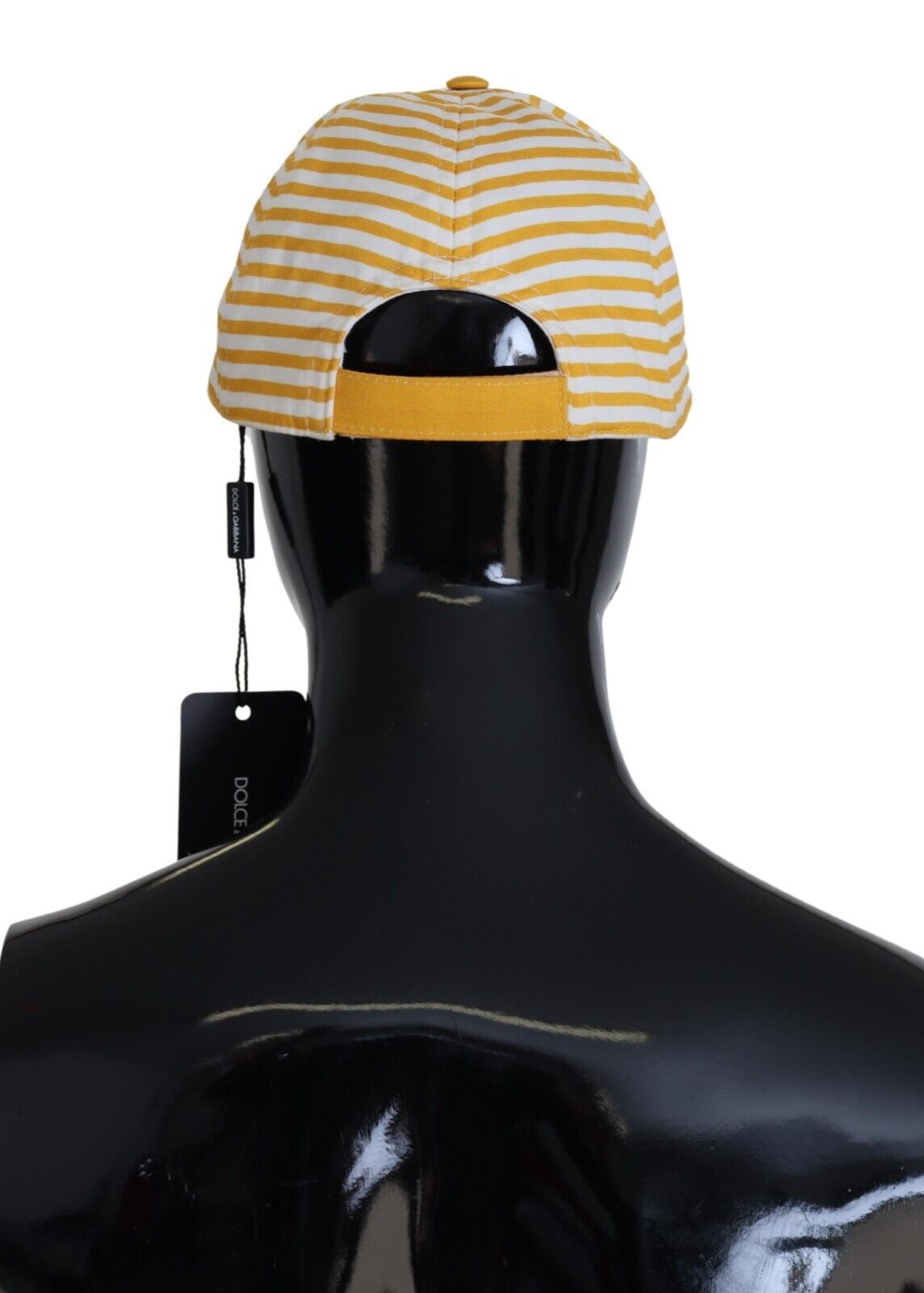 Step up your accessory game with this sophisticated, 100% Authentic Dolce & Gabbana baseball hat, brand new with tags. Straight from their exclusive MainLine collection, its yellow hue with white stripes exudes a chic yet sporty elegance. Crafted from a blend of cotton and elastane, it promises both comfort and a snug fit. Perfect for adding a touch of luxury to your everyday look while keeping you shielded from the sun in style. Made in Italy, it features subtle logo details for an extra hint of designer flair.